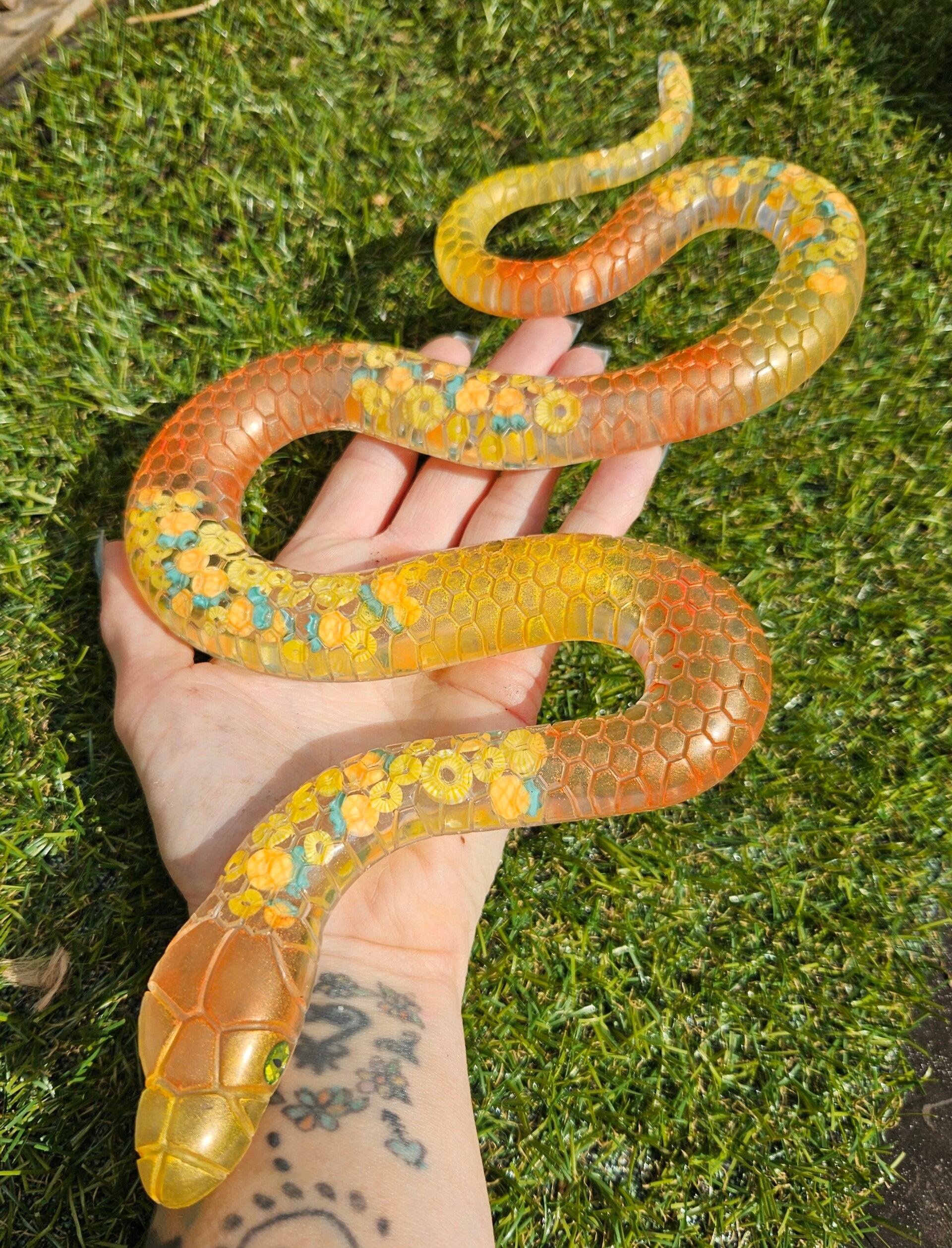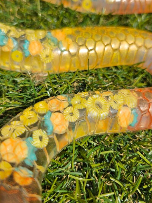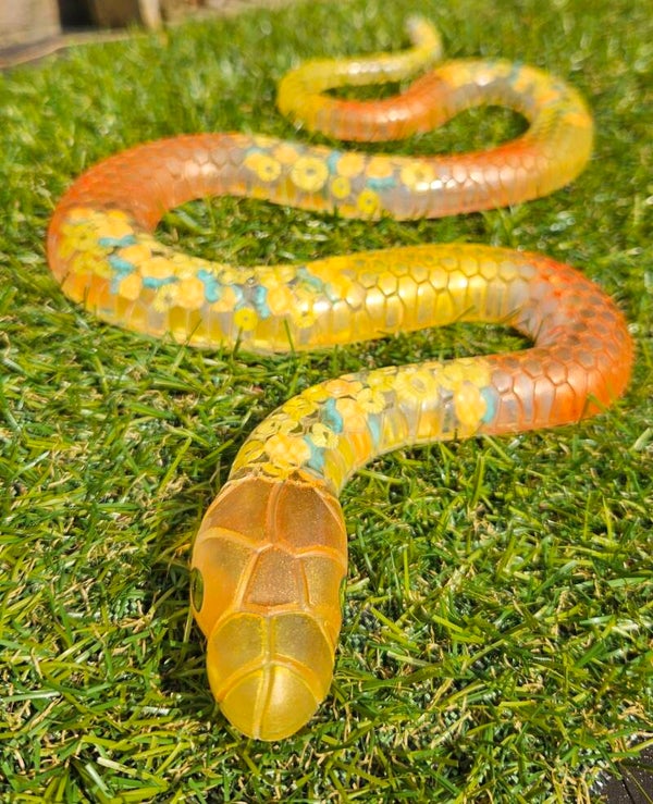 Ontmoet *Ziggy the Snake* in de variant *I Feel Fineapple* – een unieke, handgemaakte epoxy slang met vloeiende lijnen en speelse ananasjes in zijn lichaam.