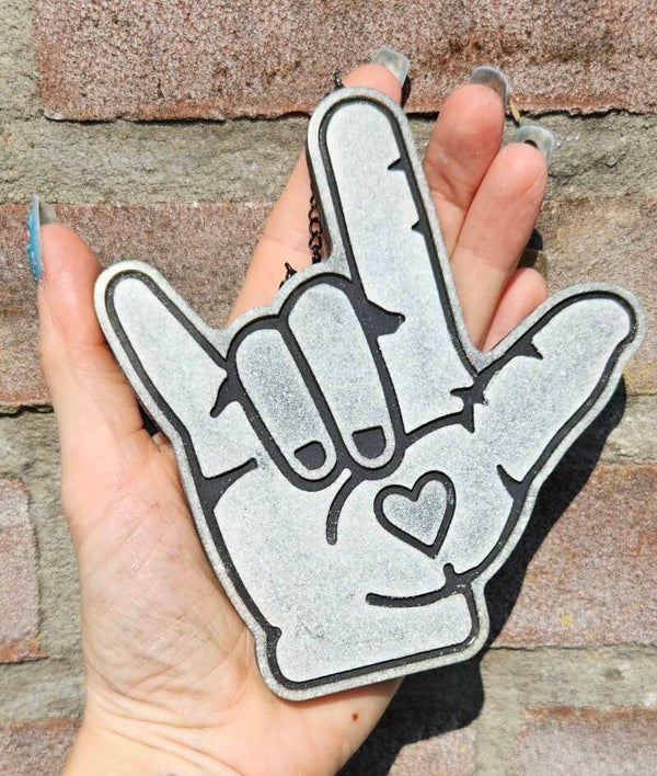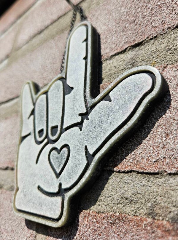 Of je nou liefde uitstraalt in gebarentaal of je innerlijke rockster laat zien – deze hanger zegt het allemaal. Met een knipoog naar zowel het "I love you"-gebaar als het iconische "metal-handje", is dit een statement piece met een hart én een randje.