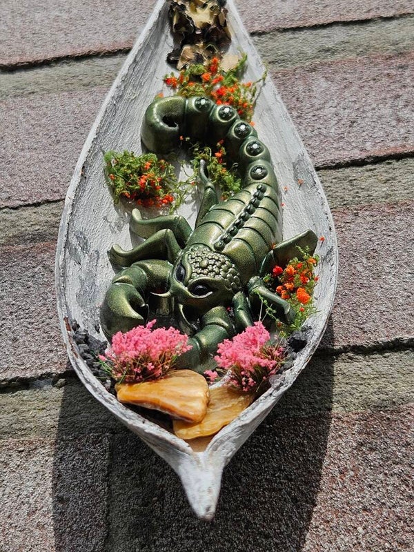 In dit handgemaakte wandobject komt het beste van twee werelden samen: de mysterieuze kracht van de schorpioen en de zachte elegantie van bloemen. Geplaatst in een natuurlijk bananenblad en afgewerkt met kleine steentjes, krijgt het geheel een aardse, haast mythische uitstraling. Een subtiele glans van epoxy geeft diepte en houdt elk element op zijn plek – als een moment in de tijd, bevroren voor altijd.