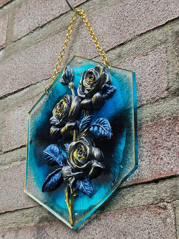 Deze zeshoek van epoxy meet 16 cm hoog, 14 cm lang en 0,5 cm dik (exclusief ophangketting) en geeft je muur een frisse, magische touch. Bovenop prijkt een zelfgegoten boeket rozen, ook van epoxy — een klein kunstwerkje in een kunstwerkje! Klaar om op te hangen en meteen een unieke eyecatcher in je huis te worden. Perfect voor iedereen die houdt van kleur, bloemen en een tikkeltje speelsheid!