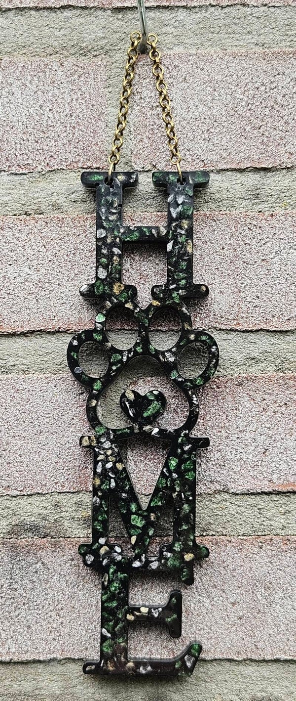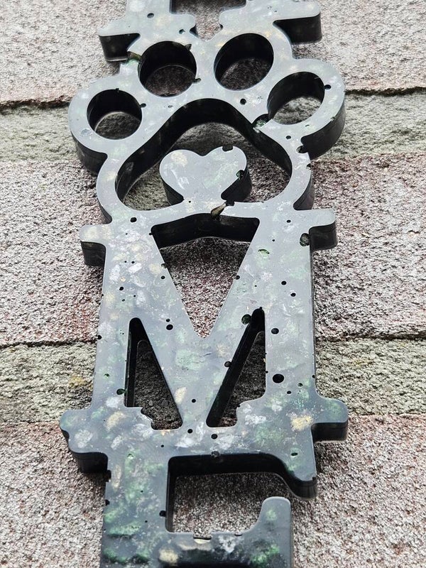 Geef je huis een liefdevolle touch met deze handgemaakte hanger van het woord *“Home”*. In de "O" vind je een hartvormig pootje – een subtiel, maar krachtig detail dat laat zien waar thuis écht is: bij de pootjes die je hart vullen.