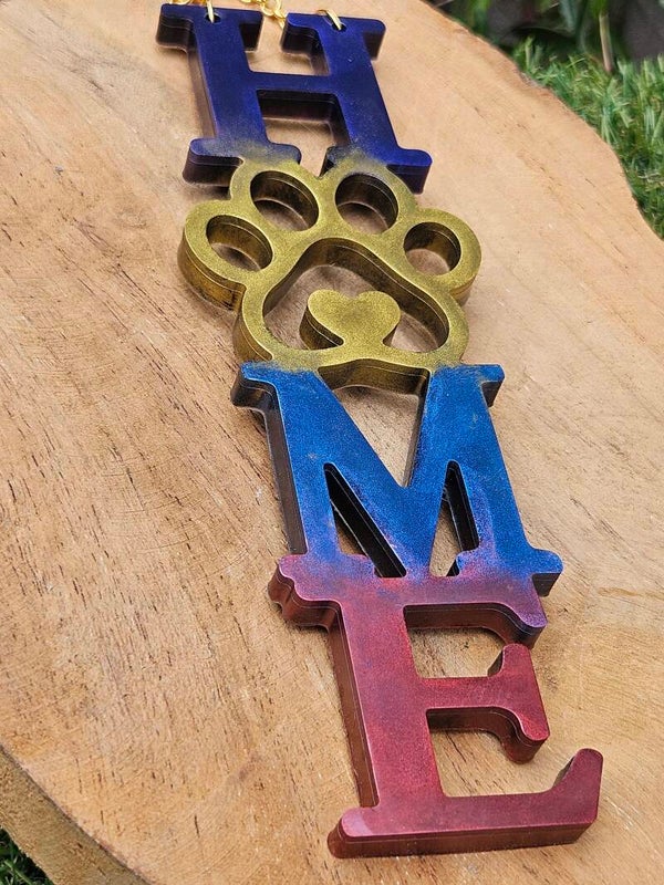 Geef je huis een liefdevolle touch met deze handgemaakte hanger van het woord *“Home”*. In de "O" vind je een hartvormig pootje – een subtiel, maar krachtig detail dat laat zien waar thuis écht is: bij de pootjes die je hart vullen.