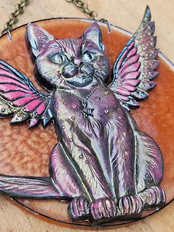 Deze unieke hanger bestaat uit een epoxy rondje (11 x 11 x 1 cm) met een handgegoten 3D katje erop, compleet met engelenvleugels. Een subtiel, hemels eerbetoon aan onze geliefde viervoeters – of ze nu nog naast je spinnen of als ster in je hart leven. 💫