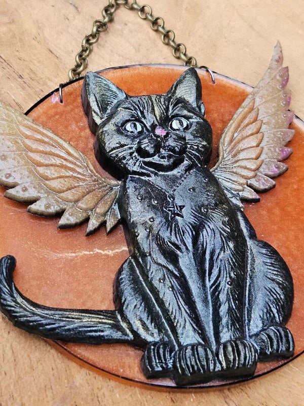Deze unieke hanger bestaat uit een epoxy rondje (11 x 11 x 1 cm) met een handgegoten 3D katje erop, compleet met engelenvleugels. Een subtiel, hemels eerbetoon aan onze geliefde viervoeters – of ze nu nog naast je spinnen of als ster in je hart leven. 💫