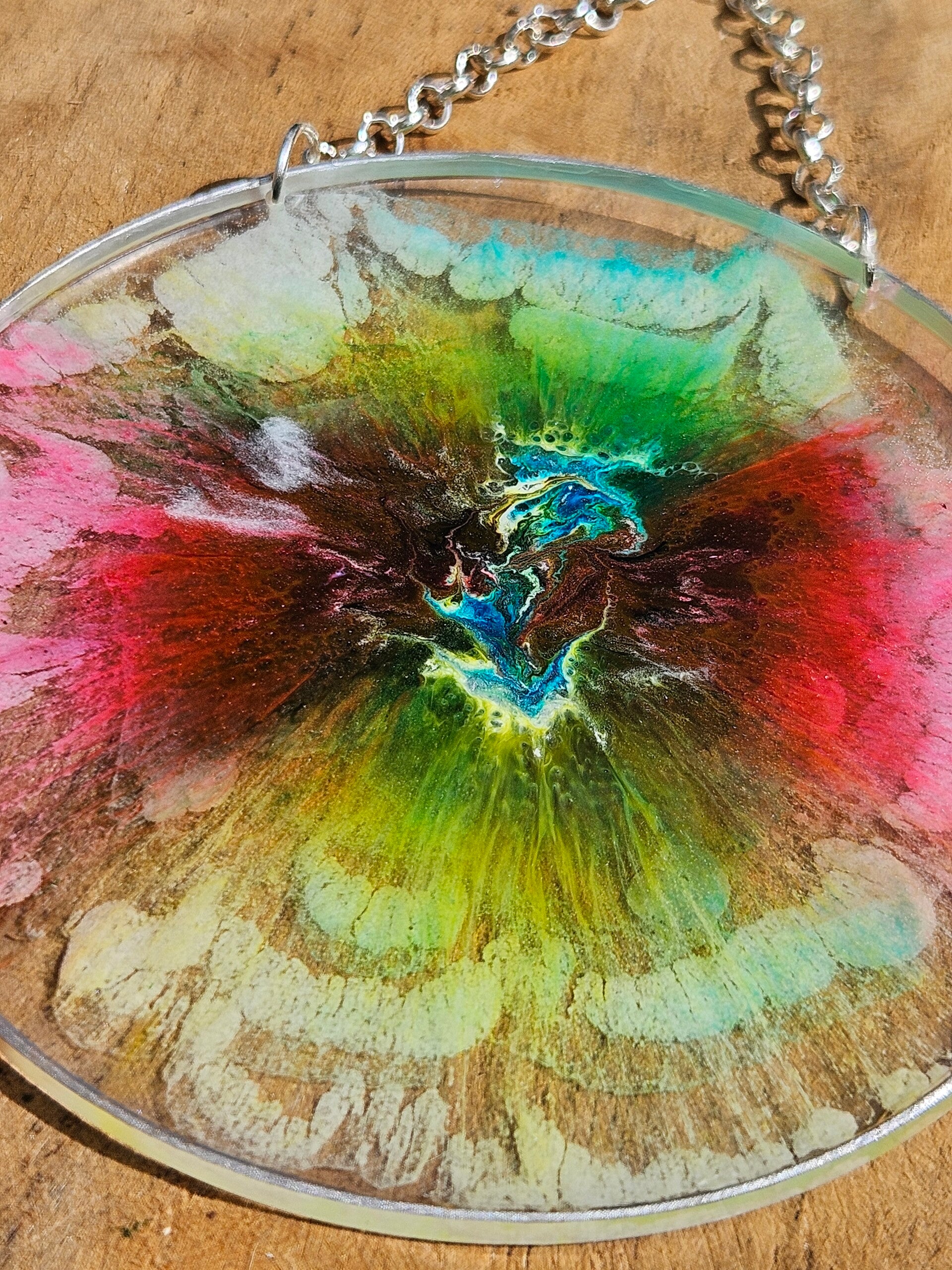Breng kleur en vrolijkheid aan je muur met deze kleine kunstwerkje! Elke cirkel is uniek, met vrolijke kleuren die lekker spelen en opvallen. Makkelijk op te hangen, zodat je ze overal kunt laten schitteren. Perfect voor wie houdt van een beetje extra kleur en creativiteit in huis! De diameter van de cirkel is 10 cm.