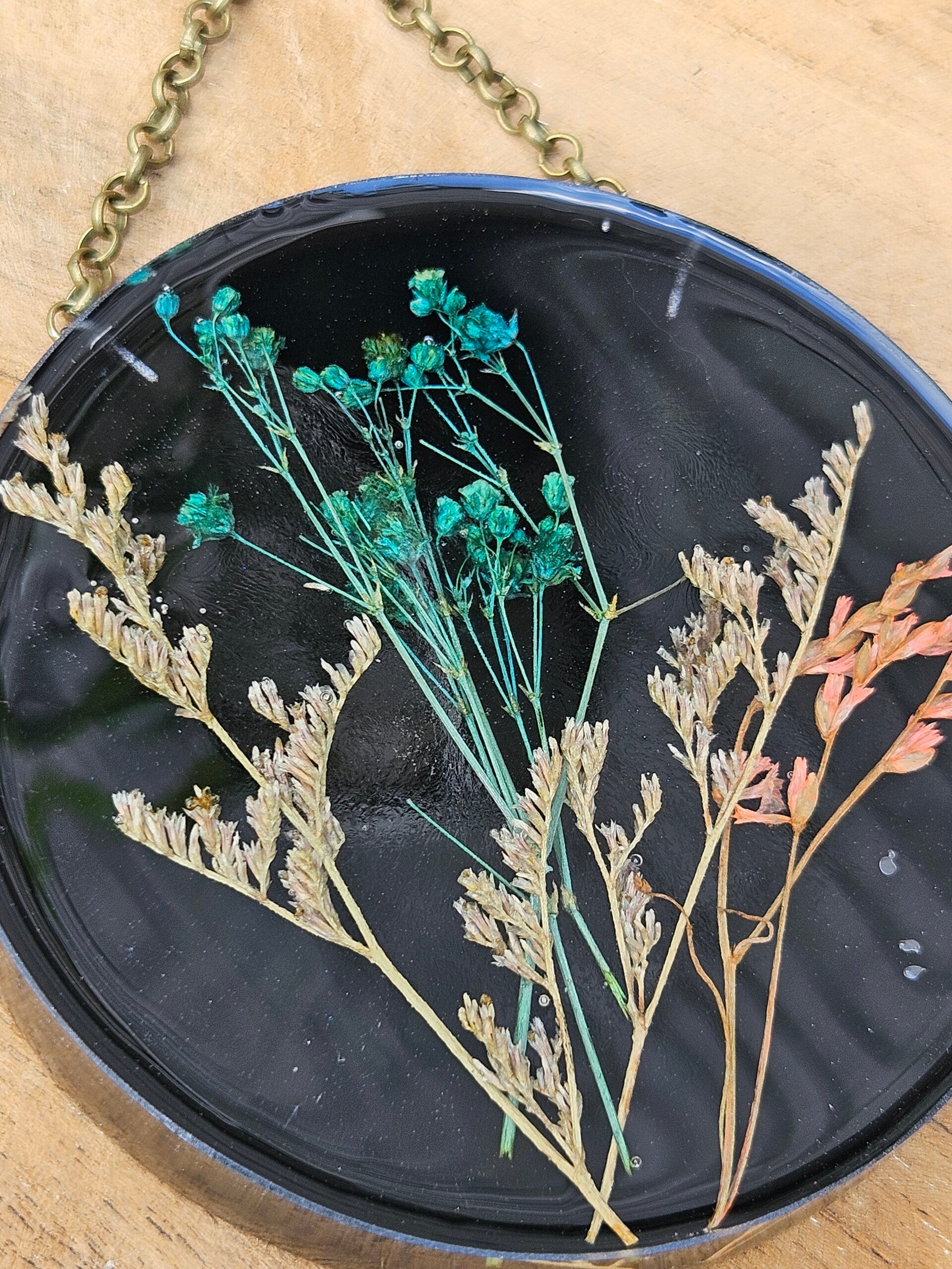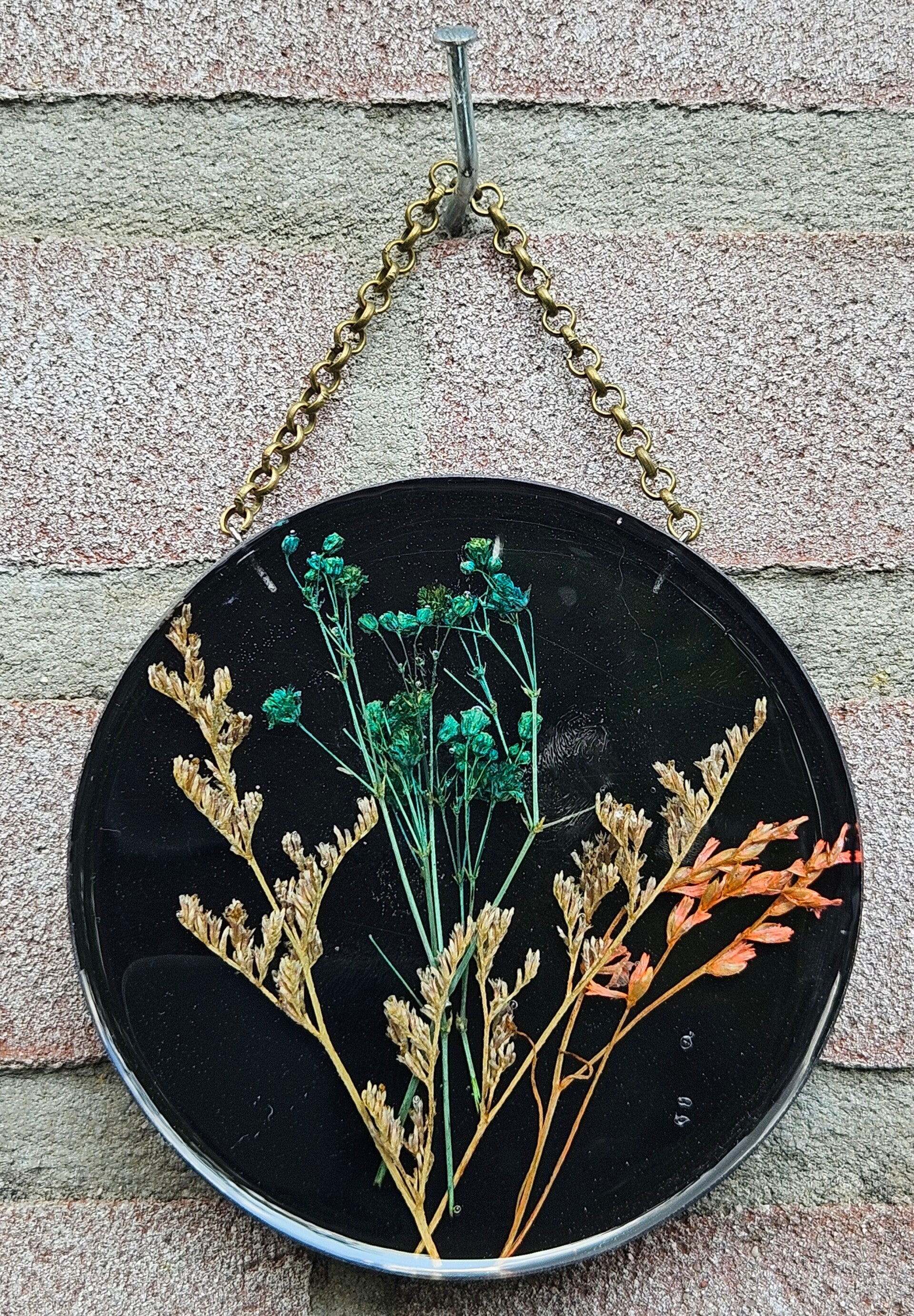Dit kunstwerkje is gemaakt van sprankelend epoxy en bevatten echte, zorgvuldig gedroogde bloemen. Elke cirkel is uniek, vol kleur en natuurlijke schoonheid, perfect om je muur een frisse, speelse en botanische touch te geven. Makkelijk op te hangen — zo haal je een stukje natuur en kleur in huis.
