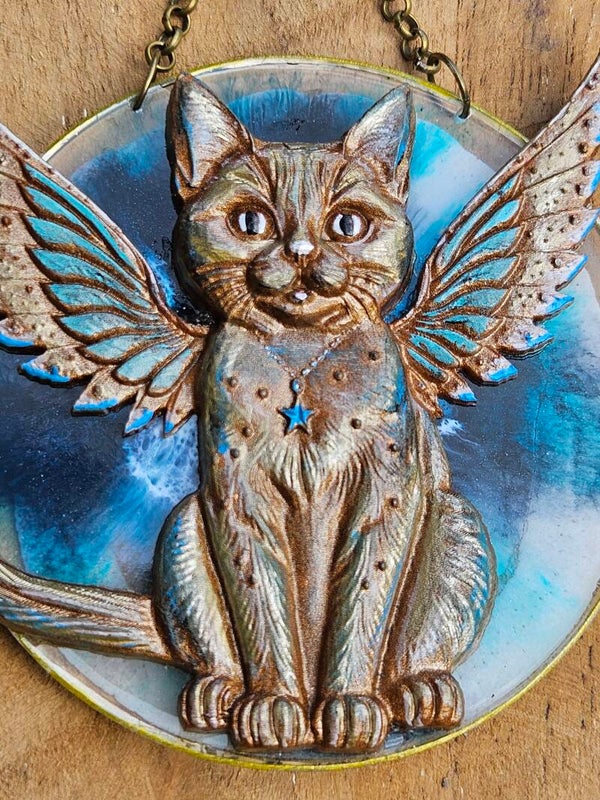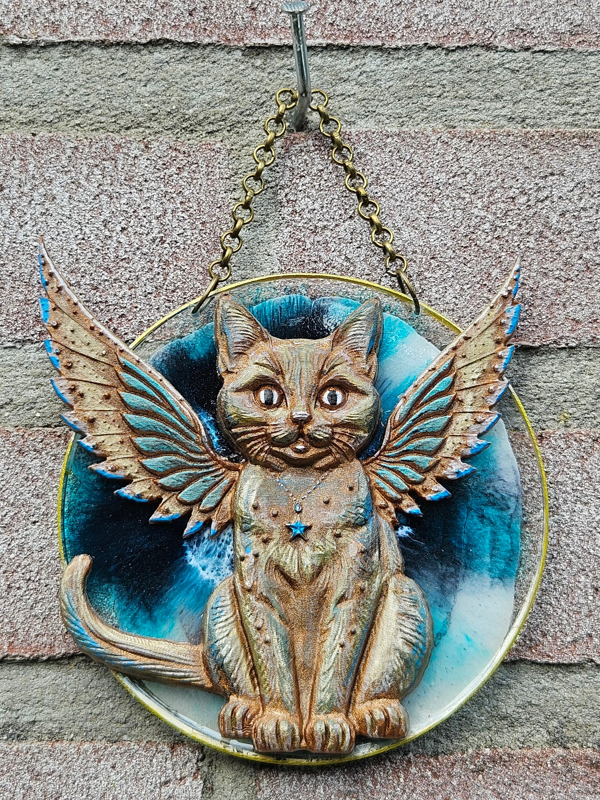 Deze unieke hanger bestaat uit een epoxy rondje (11 x 11 x 1 cm) met een handgegoten 3D katje erop, compleet met engelenvleugels. Een subtiel, hemels eerbetoon aan onze geliefde viervoeters – of ze nu nog naast je spinnen of als ster in je hart leven. 💫