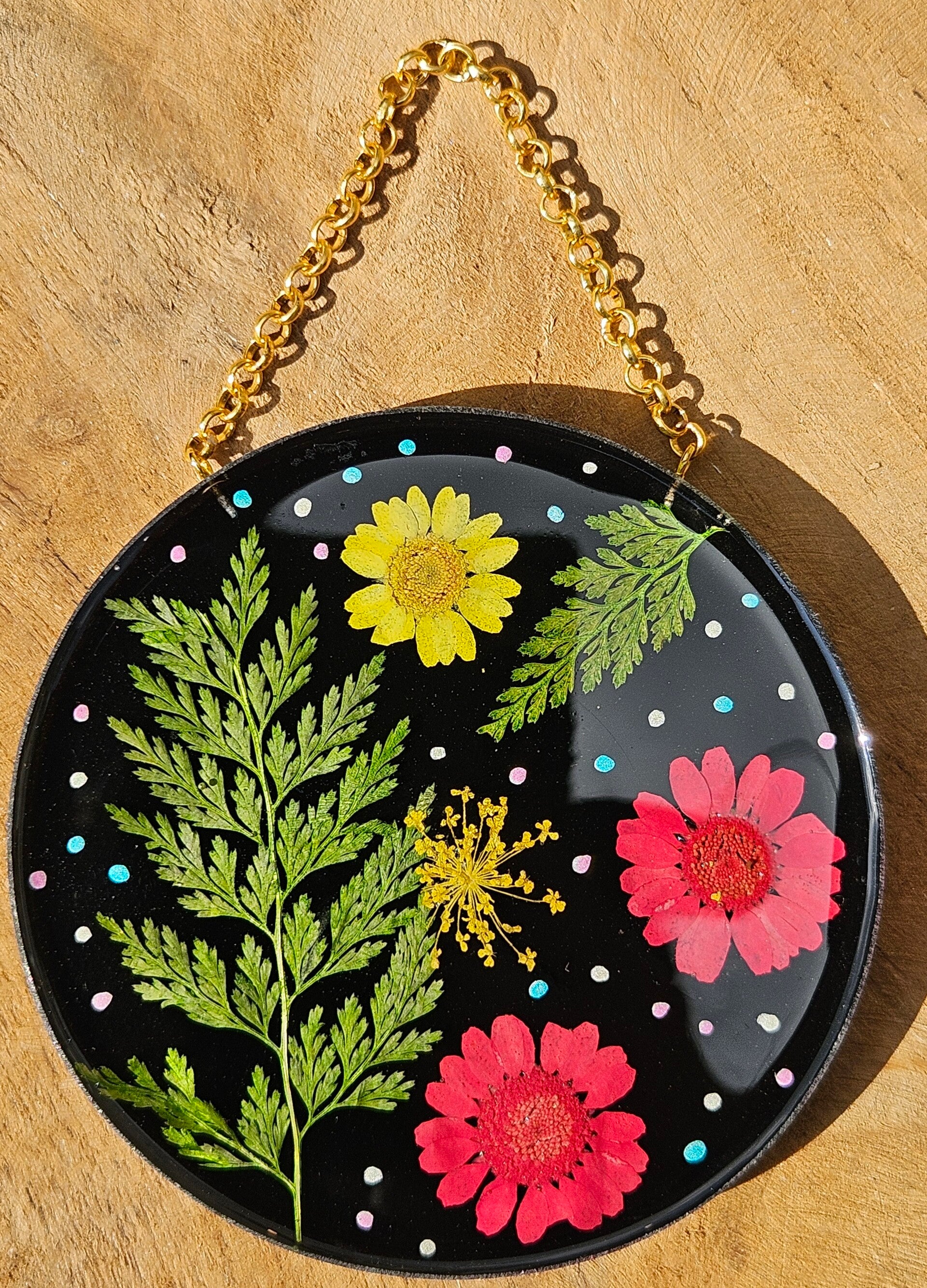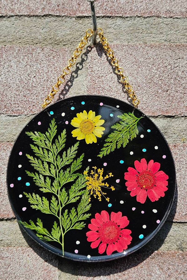 Dit kunstwerkje is gemaakt van sprankelend epoxy en bevat echte, zorgvuldig gedroogde bloemen. Elke cirkel is uniek, vol kleur en natuurlijke schoonheid, perfect om je muur een frisse, speelse en botanische touch te geven. Makkelijk op te hangen — zo haal je een stukje natuur en kleur in huis.