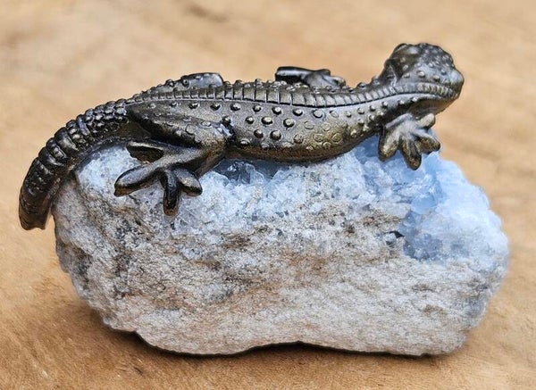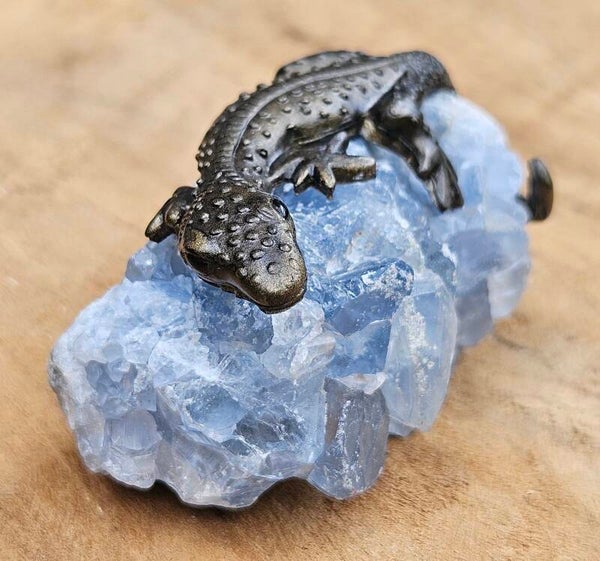 Dit kleine kunstwerkje brengt speelsheid en rust samen. Een handgemaakt epoxy hagedisje (6 cm) rust op een natuurlijk stukje celestien, bekend om zijn zachte, hemelsblauwe kleur. Een charmant en uniek decoratiestuk dat perfect is voor op een plankje, vensterbank of als origineel cadeautje.