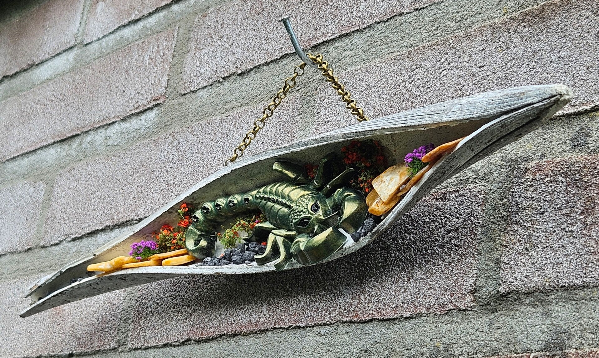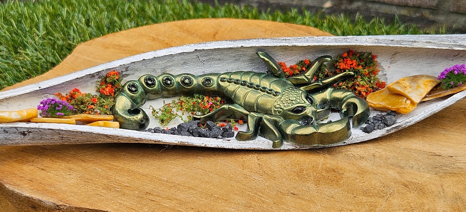 Een klein beetje mysterie, een tikkeltje avontuur en een flinke dosis natuurvibes – dat is dit unieke wandobject! In een knus, licht dichtgevouwen bananenblad ligt een stoere epoxy schorpioen te wachten om je interieur op te vrolijken. Omringd door glinsterende steentjes en bloemen, brengt dit kunstwerk een speels randje aan je muur.