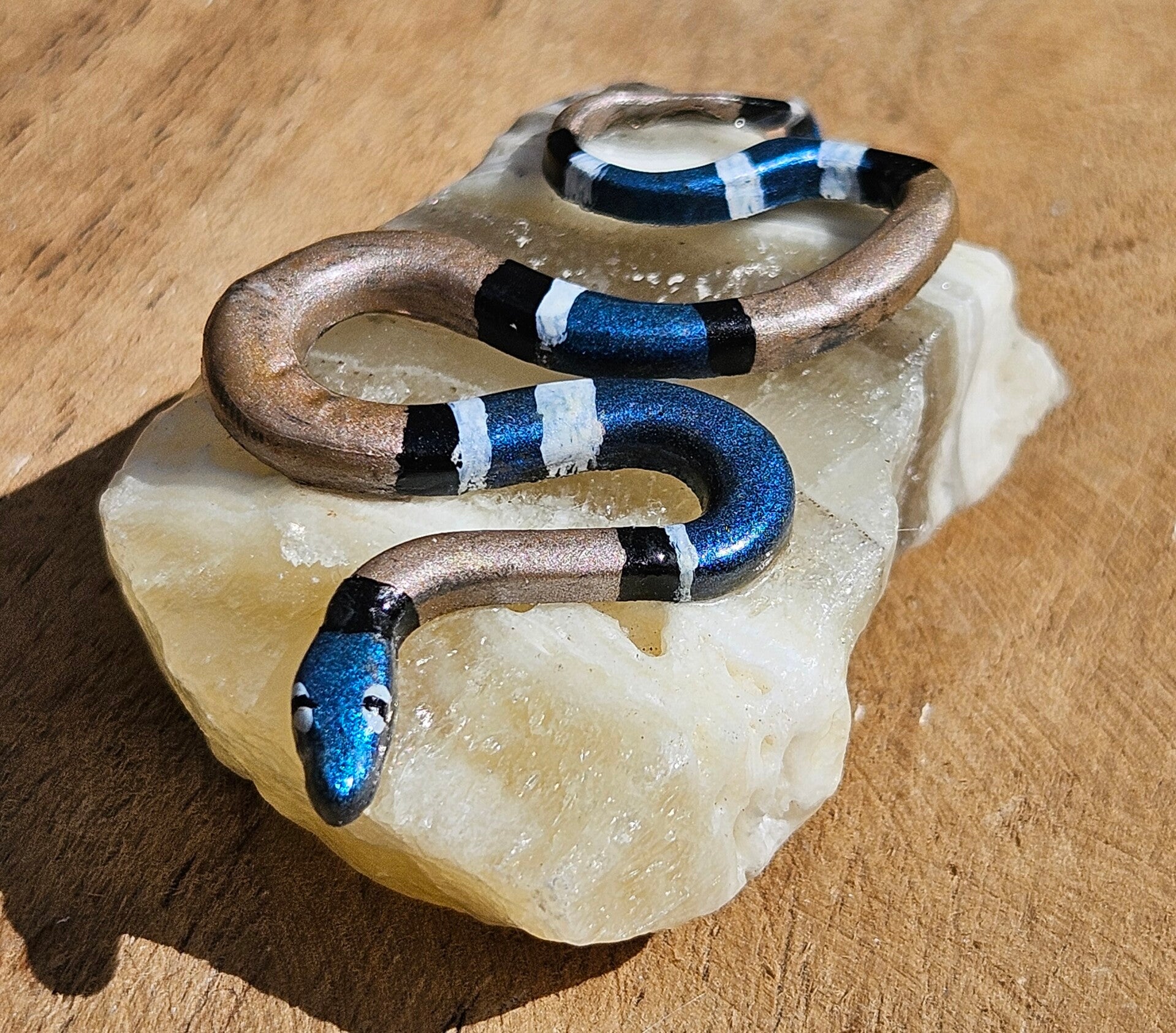 Dit kleine, speelse slangetje van epoxy slingert zich over een stuk stoere zebra calciet. Het contrast tussen de gladde epoxy en de natuurlijk gestreepte steen maakt dit kunstwerkje uniek en levendig. Een bijzonder object vol karakter – perfect als klein cadeautje of een subtiel detail in je interieur.