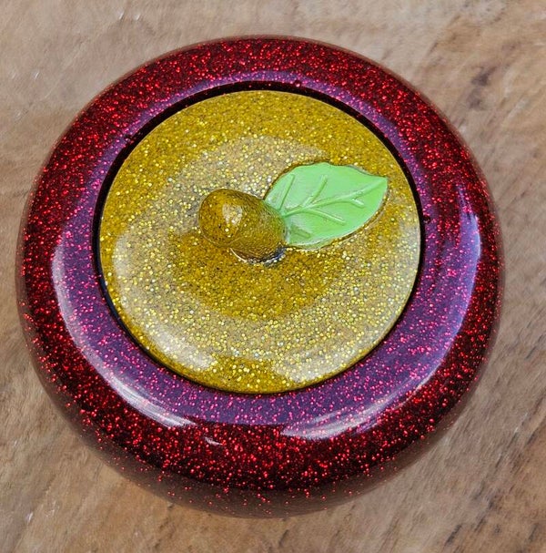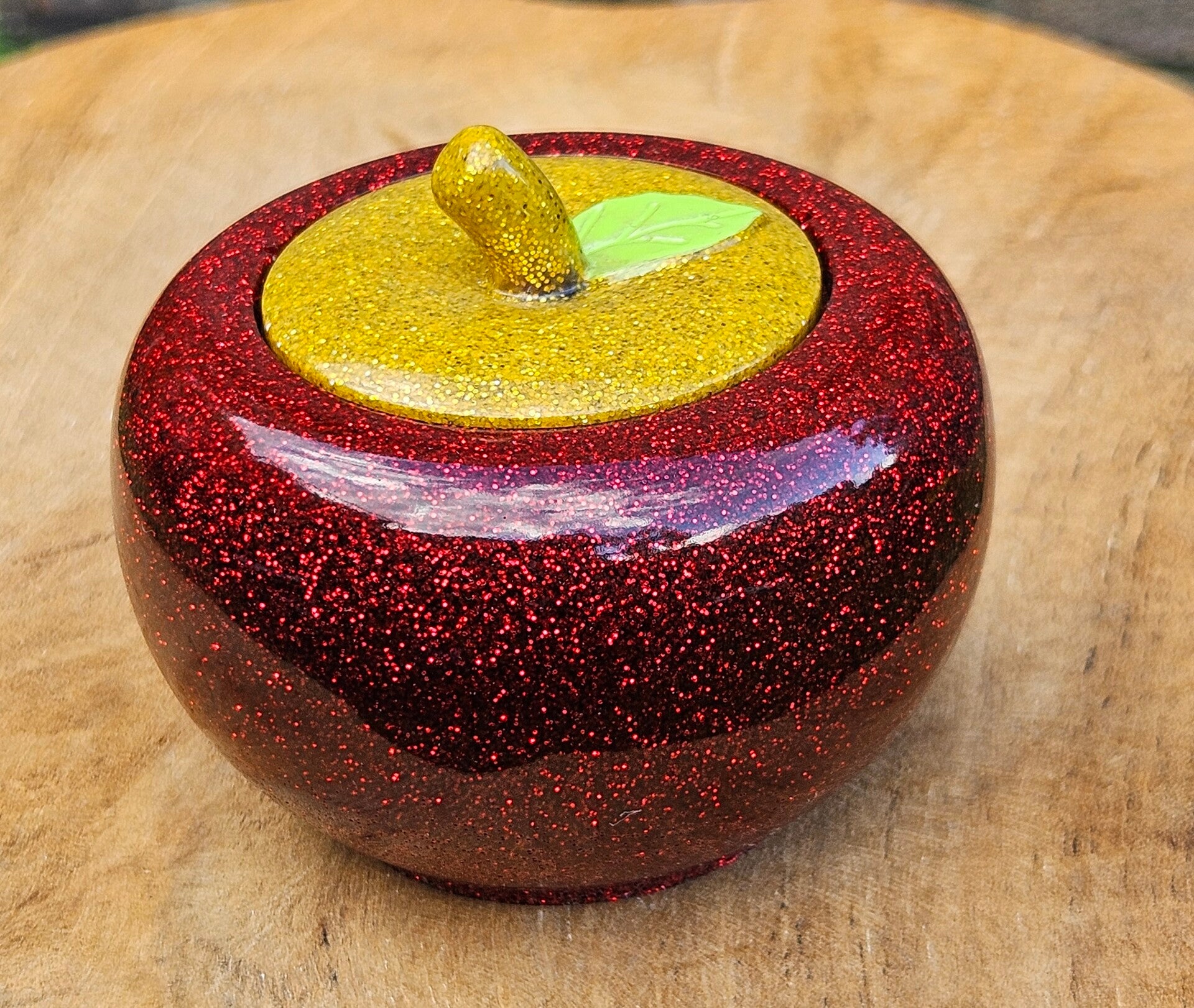 Dit handgemaakte potje in de vorm van een appel is perfect voor het opbergen van sieraden, paperclips, muntjes of andere kleine schatten. Gemaakt van glanzende epoxy in vrolijke kleuren en een echte eyecatcher op je bureau, nachtkastje of plankje.