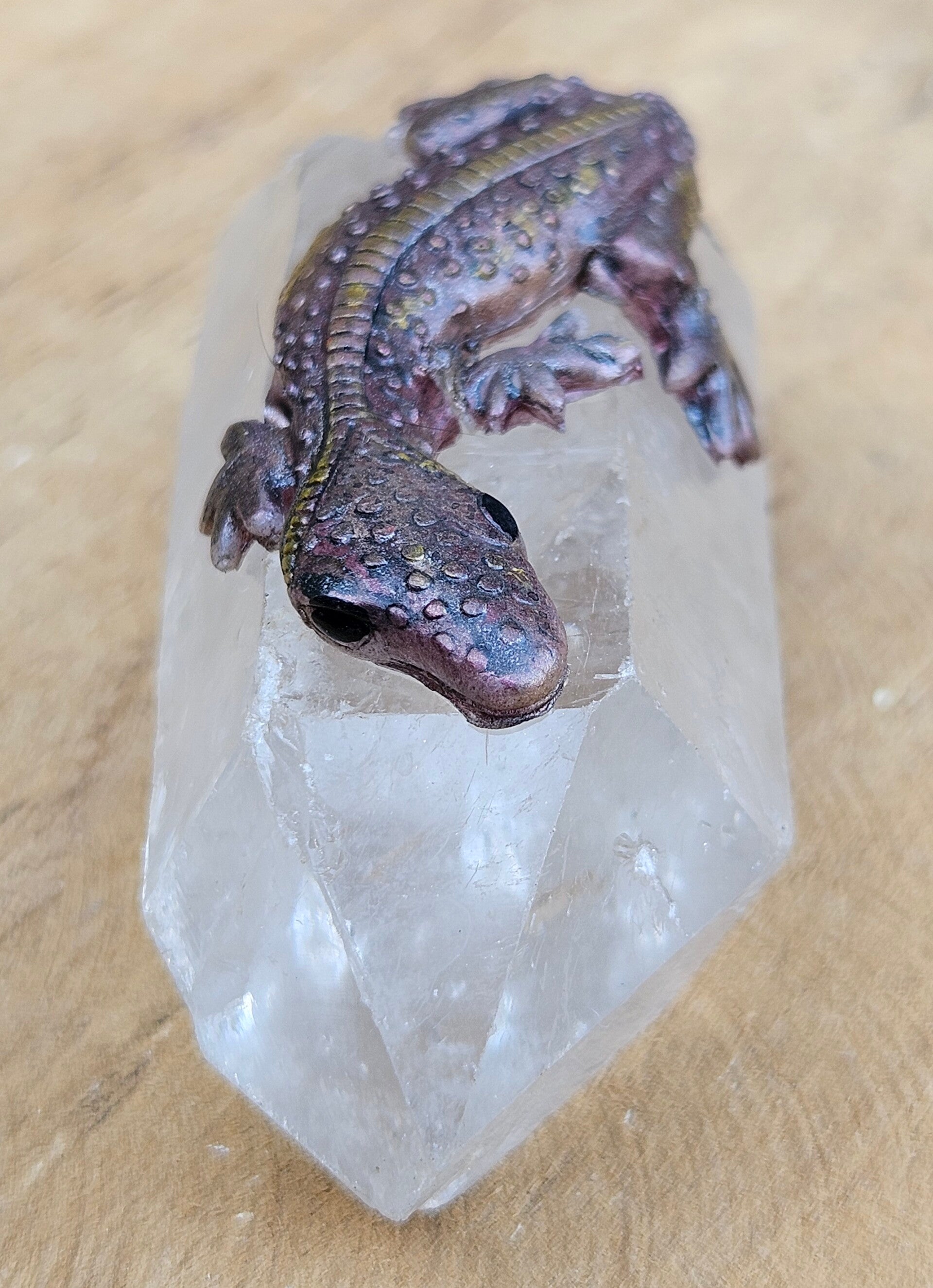 *Epoxy hagedisje op bergkristalpunt – 7,5 x 3,3 x 3 cm*