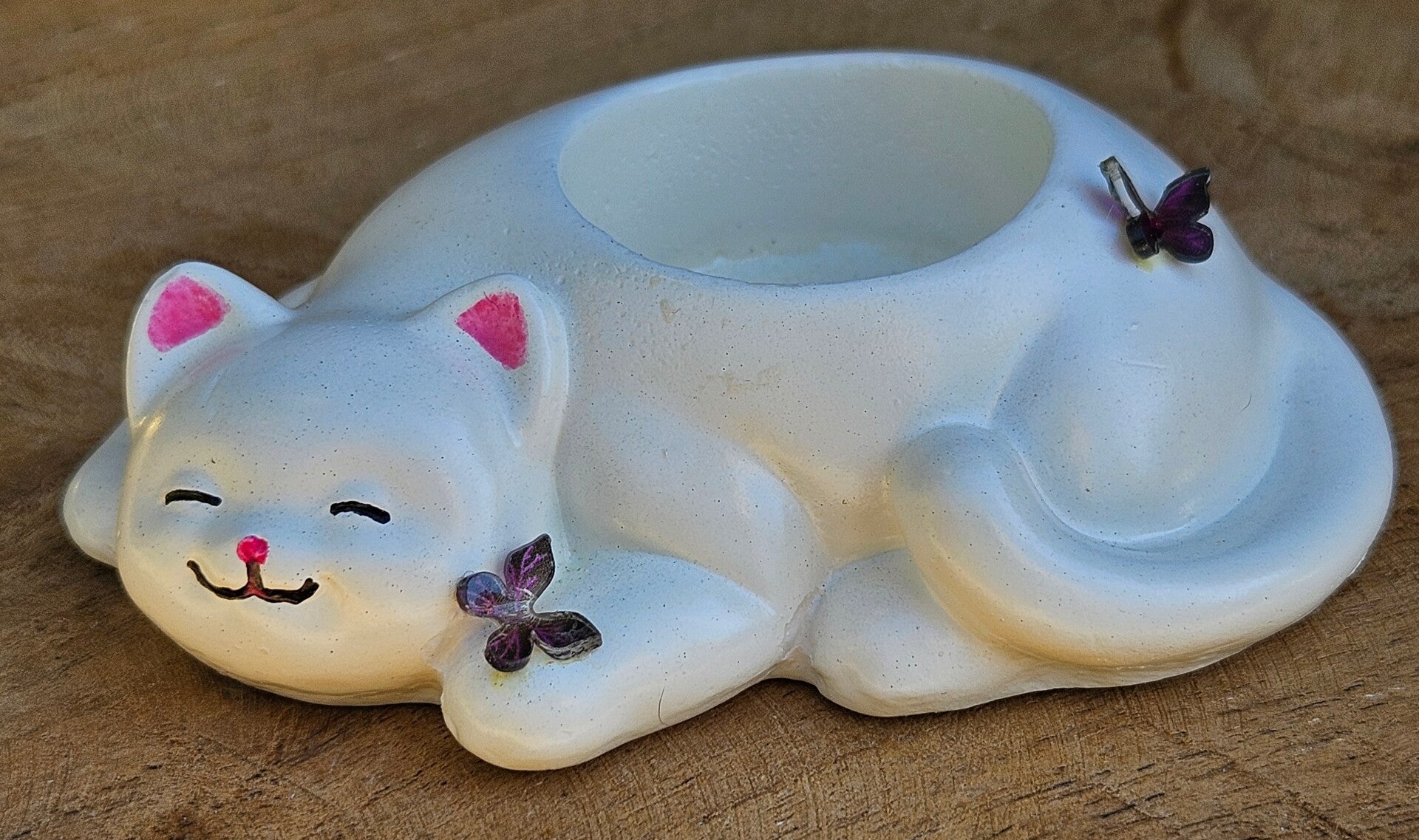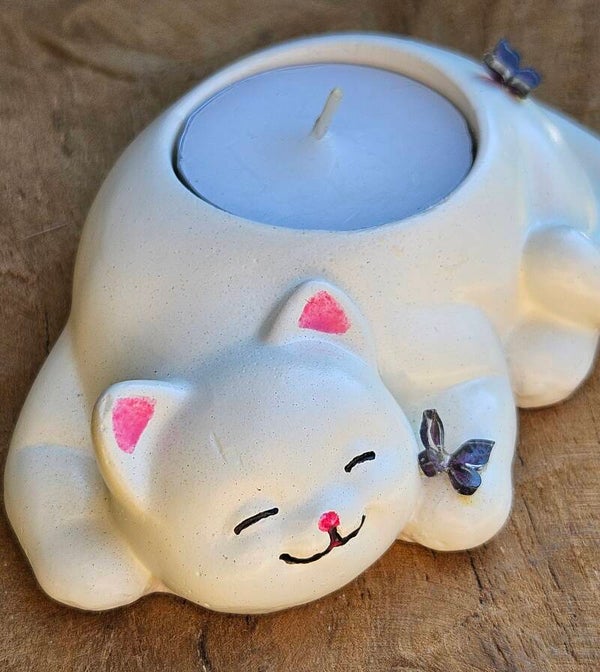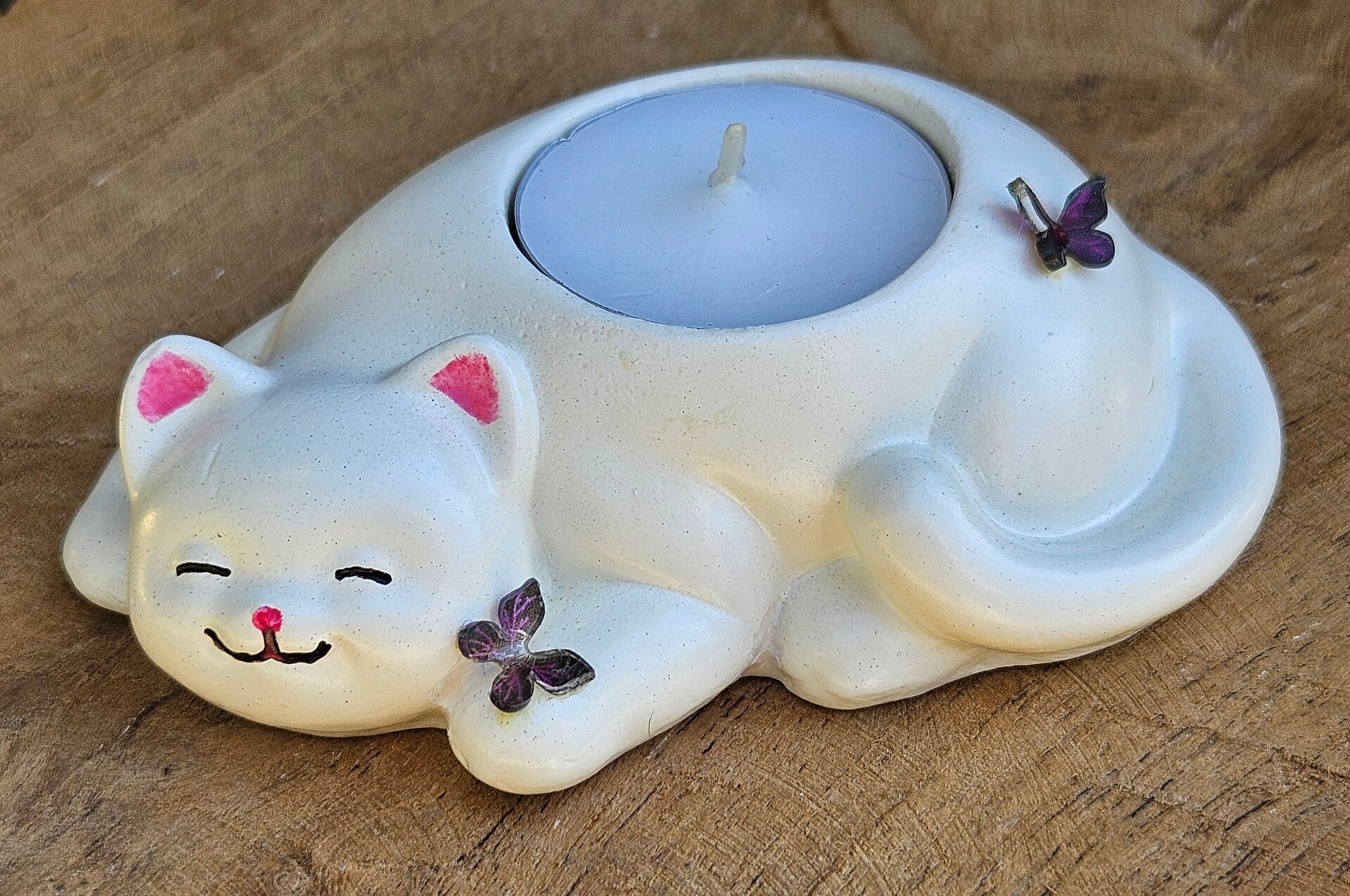 "Waxinelichthouder Kat" Wit Butterfly Gips