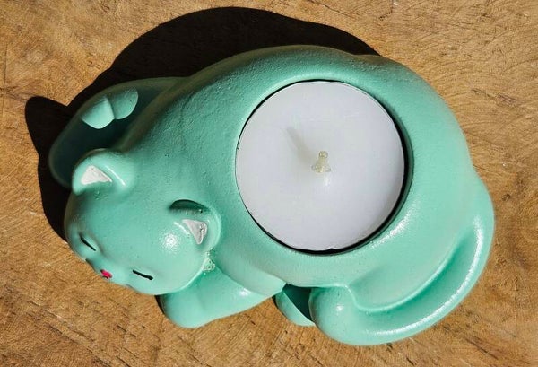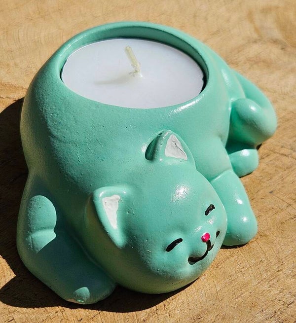 Breng sfeer en warmte in huis met dit schattige katje van gips. Elke waxinelichthouder is met de hand gegoten en uniek van kleur en afwerking. Perfect voor op tafel, op de vensterbank of als cadeautje voor een kattenliefhebber. Geschikt voor een standaard waxinelichtje. Er zit een waxinelichtje inbegrepen.