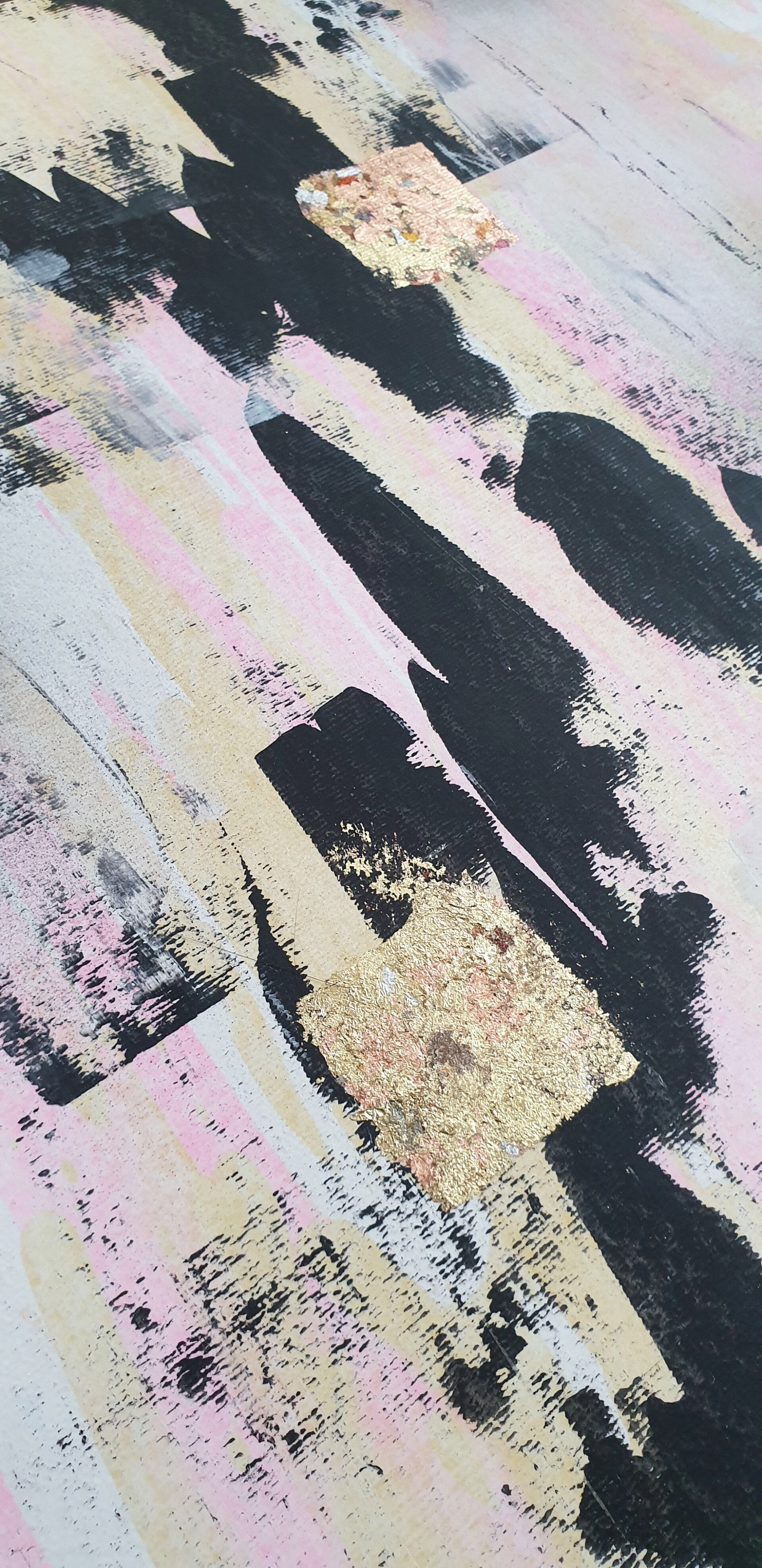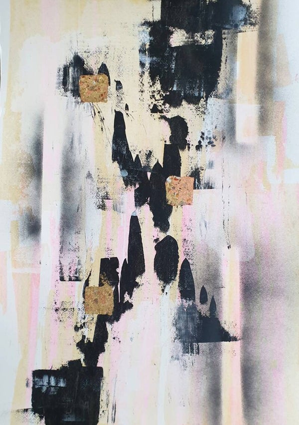 Origineel kunstwerk, geen print.Gemaakt met spraypaint en goudpapier op 400 grams acrylpapier.Afmetingen: 50 x 70 cm.Het werk wordt zonder lijst geleverd, zodat je het geheel naar eigen smaak kunt inlijsten.