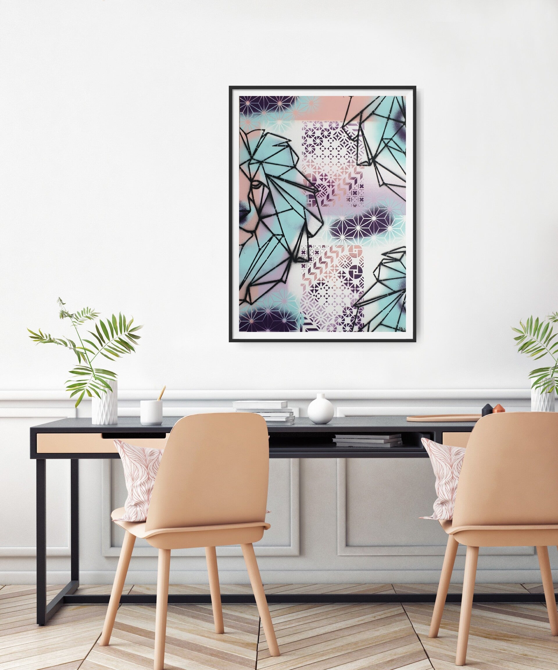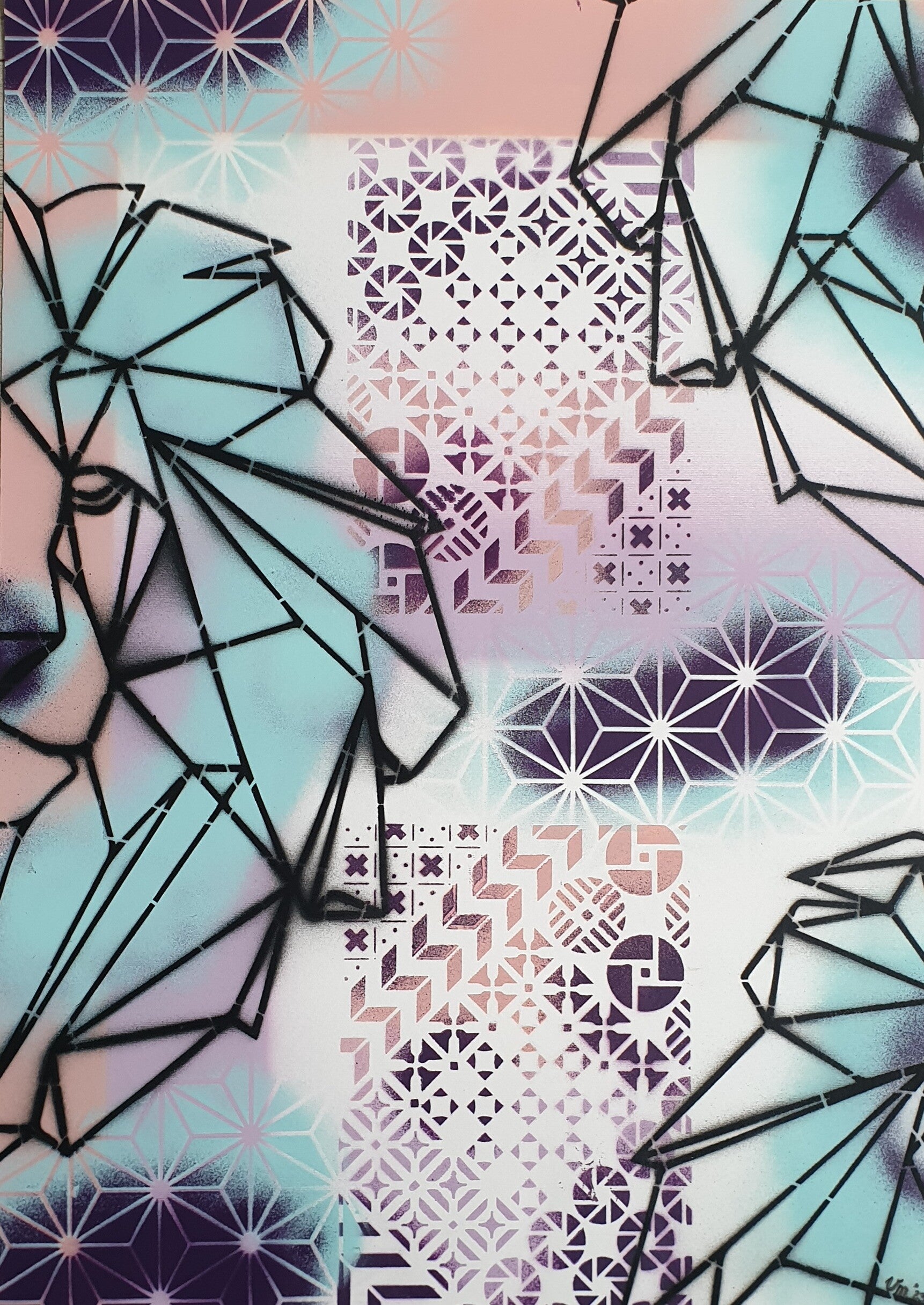 Origineel kunstwerk, geen print.Gemaakt met spraypaint op 400 grams acrylpapier.Afmetingen: 50 x 70 cm.Het werk wordt zonder lijst geleverd, zodat je het geheel naar eigen smaak kunt inlijsten.