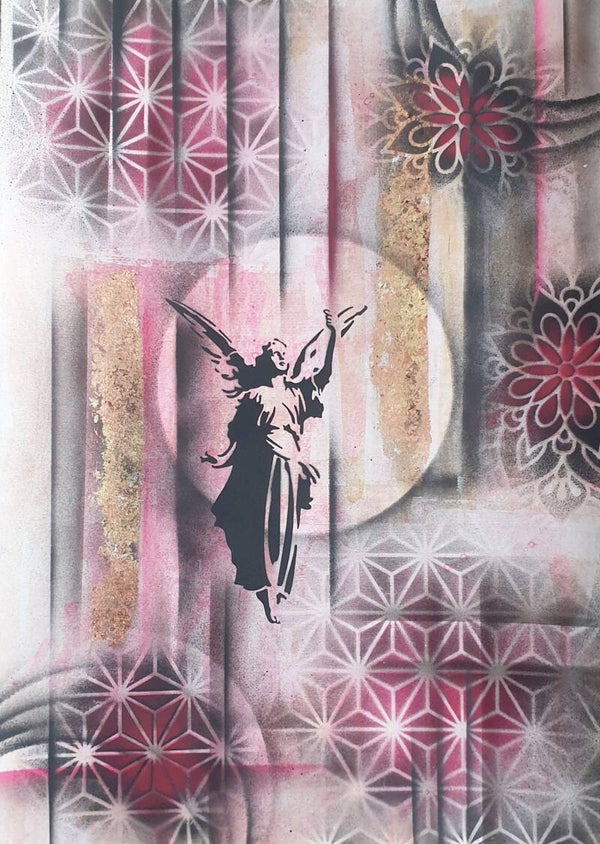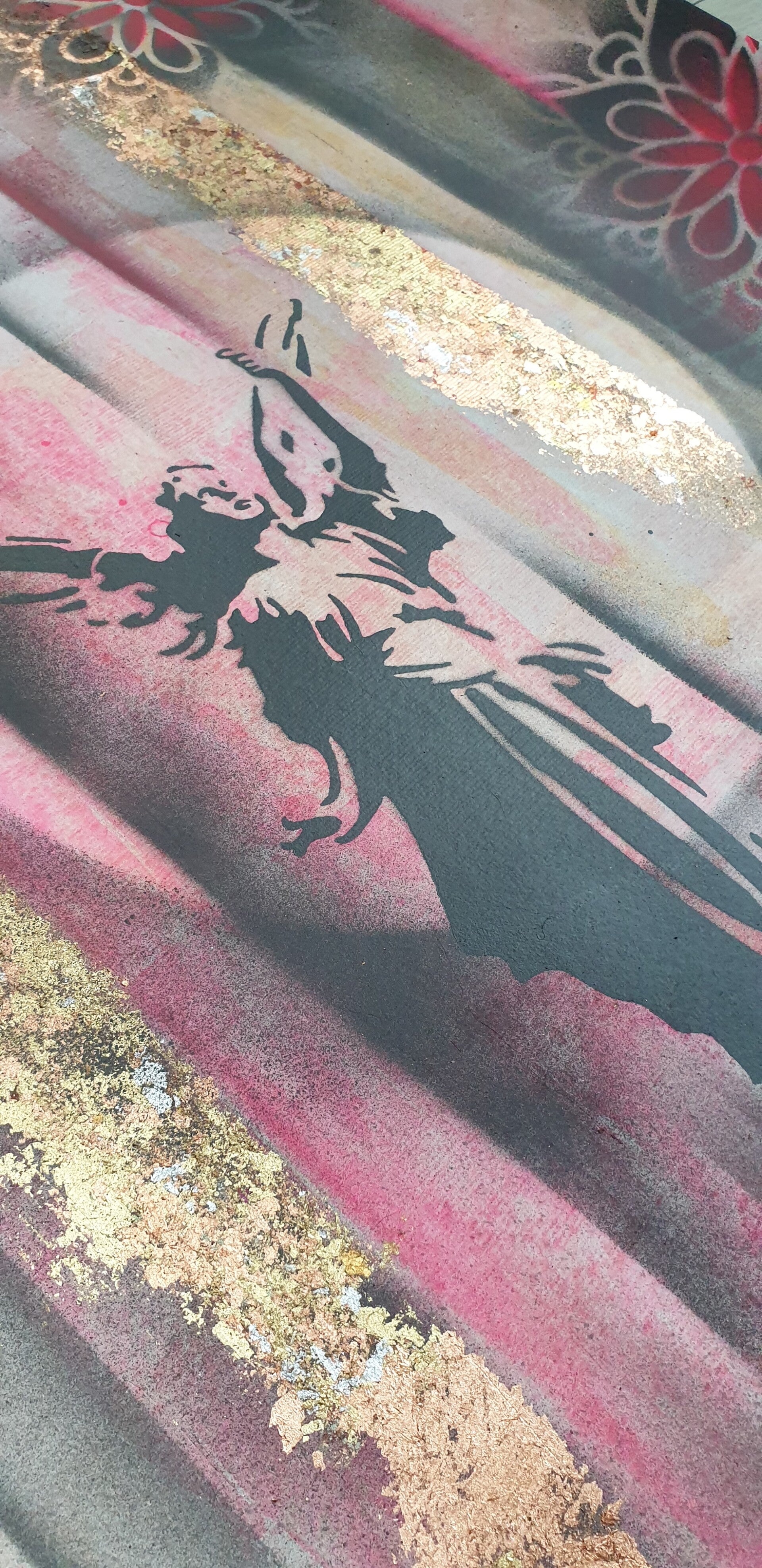Gemaakt met spraypaint en goudpapier op 400 grams acrylpapier.