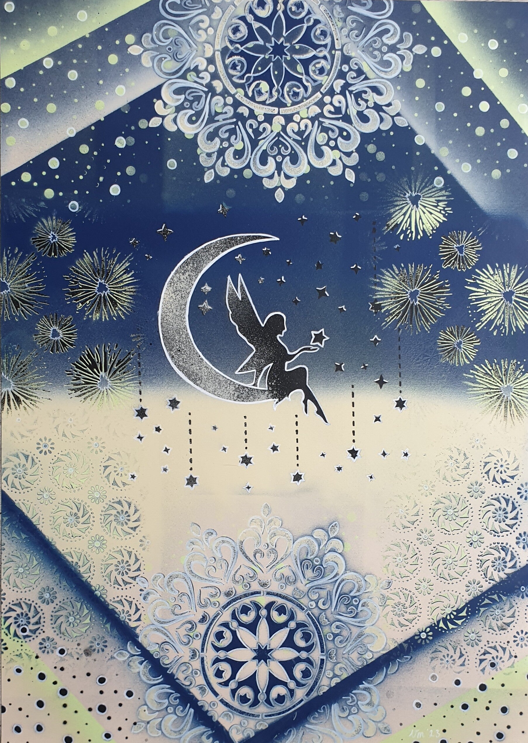 Gemaakt met spraypaint op 400 grams acrylpapier.