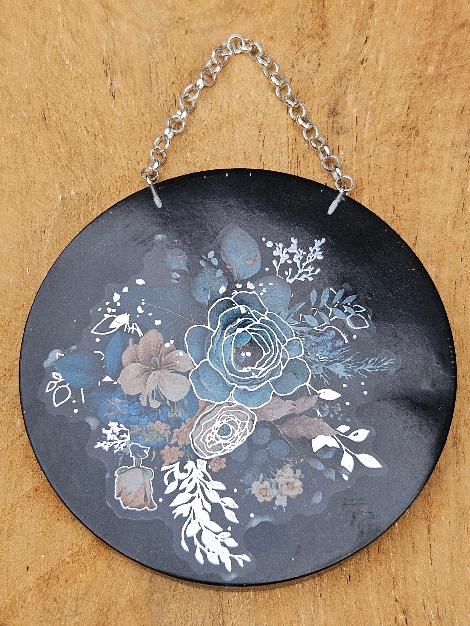 Dit kunstwerkje is gemaakt van sprankelend epoxy en heeft een afbeelding van een boeket. De cirkel krijgt een elegante touch dankzij een subtiel zilvereneffect in de ingegoten sticker, die het geheel een extra glans en verfijning geeft. Elke cirkel is uniek, vol kleur en natuurlijke schoonheid, perfect om je muur een frisse, speelse en botanische touch te geven. Makkelijk op te hangen — zo haal je een stukje natuur en kleur in huis.