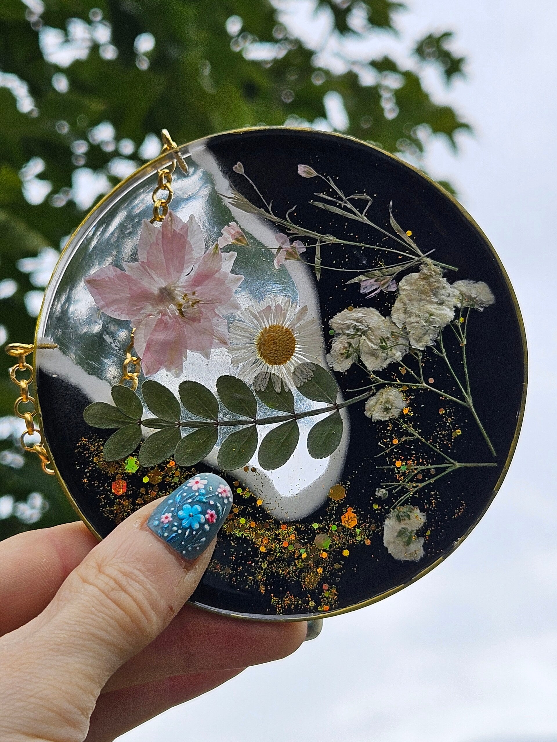 Dit kunstwerkje is gemaakt van sprankelend epoxy en bevat echte, zorgvuldig gedroogde bloemen. Elke cirkel is uniek, vol kleur en natuurlijke schoonheid, perfect om je muur een frisse, speelse en botanische touch te geven. Makkelijk op te hangen — zo haal je een stukje natuur en kleur in huis.