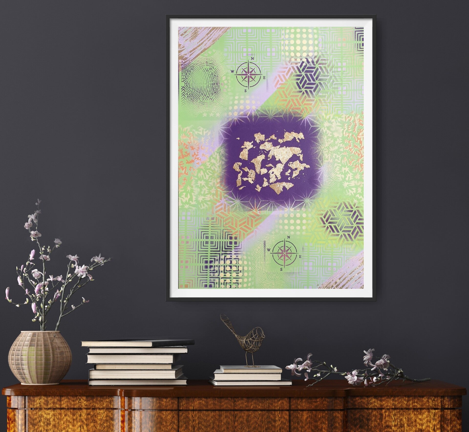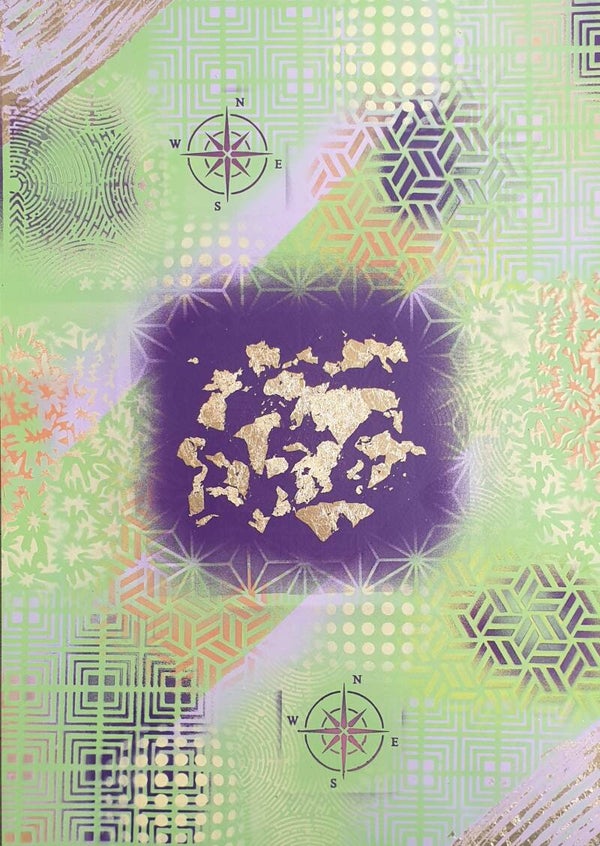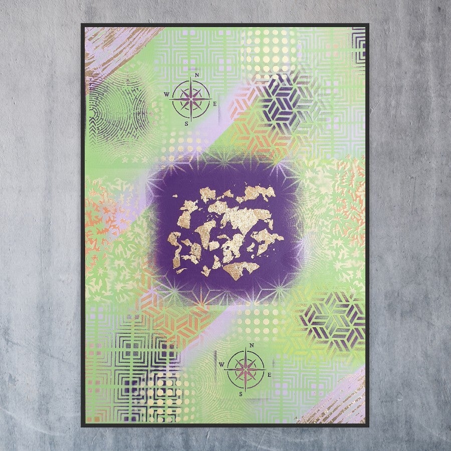 Origineel kunstwerk, geen print.Gemaakt met spraypaint en goudpapier op 400 grams acrylpapier.Afmetingen: 50 x 70 cm.Het werk wordt zonder lijst geleverd, zodat je het geheel naar eigen smaak kunt inlijsten.