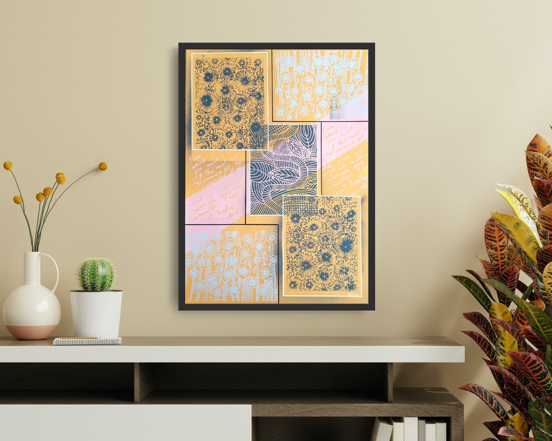 Origineel kunstwerk, geen print.Gemaakt met spraypaint en acrylmarkers op 400 grams acrylpapier.Afmetingen: 50 x 70 cm.Het werk wordt zonder lijst geleverd, zodat je het geheel naar eigen smaak kunt inlijsten.