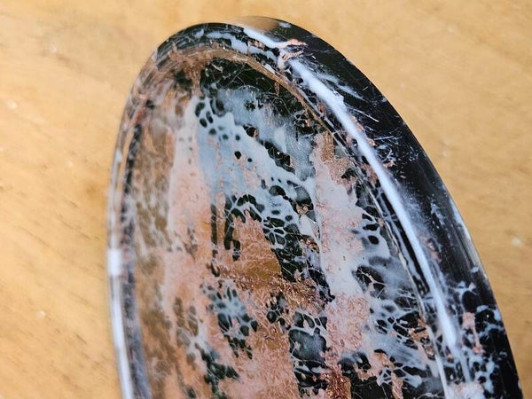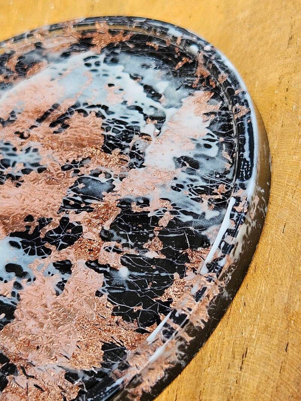 Dit elegante epoxy bordje met met een bijzondere structuur heeft een diameter van 16 cm is perfect voor het presenteren van en leuk herfststuk, sieraden of andere mooie items. De rand heeft een hoogte van 1 cm, terwijl het ondiepe bakje zelf 0,5 cm diep is — ideaal voor een subtiele en stijlvolle touch op tafel of in je interieur.