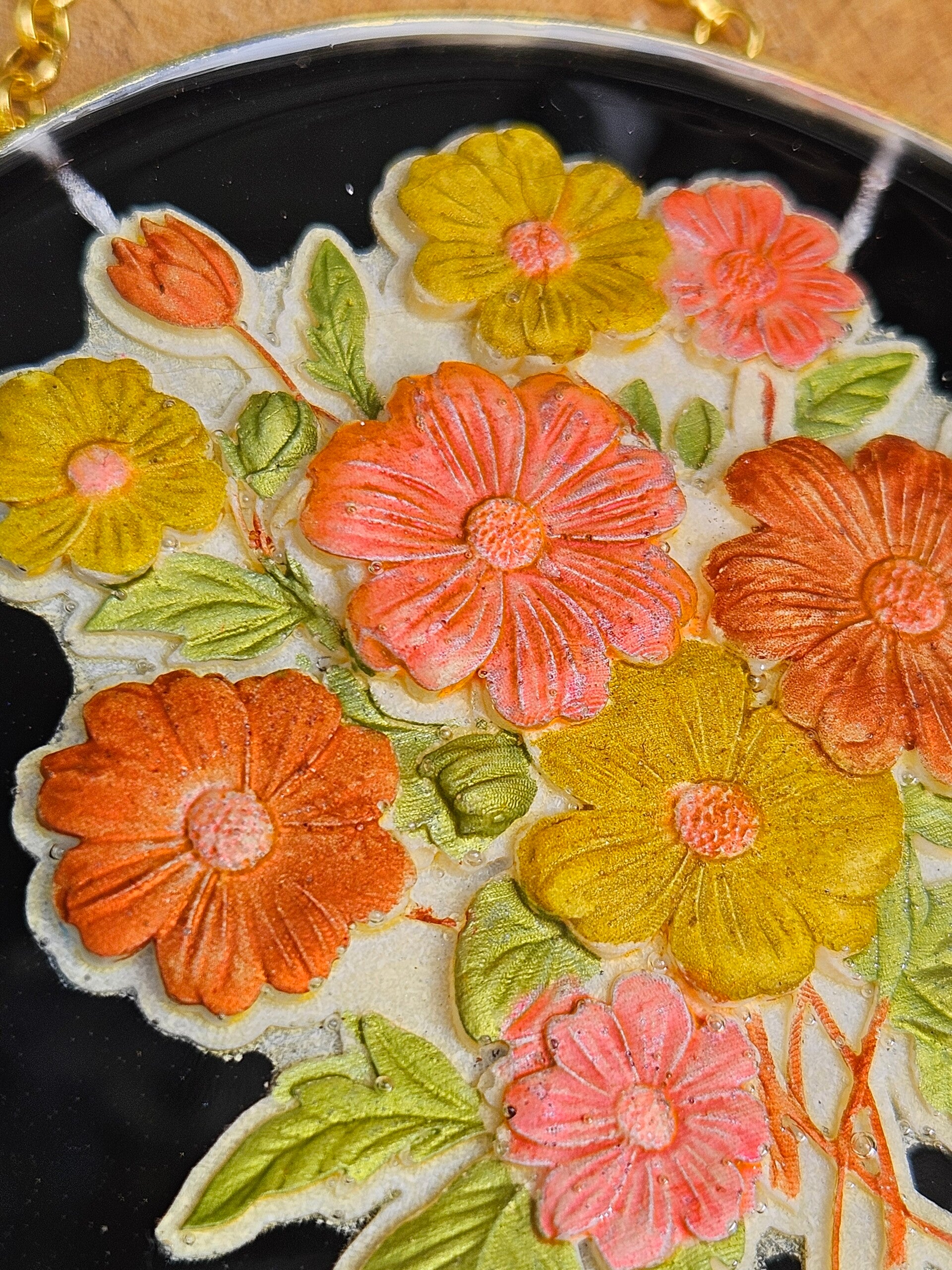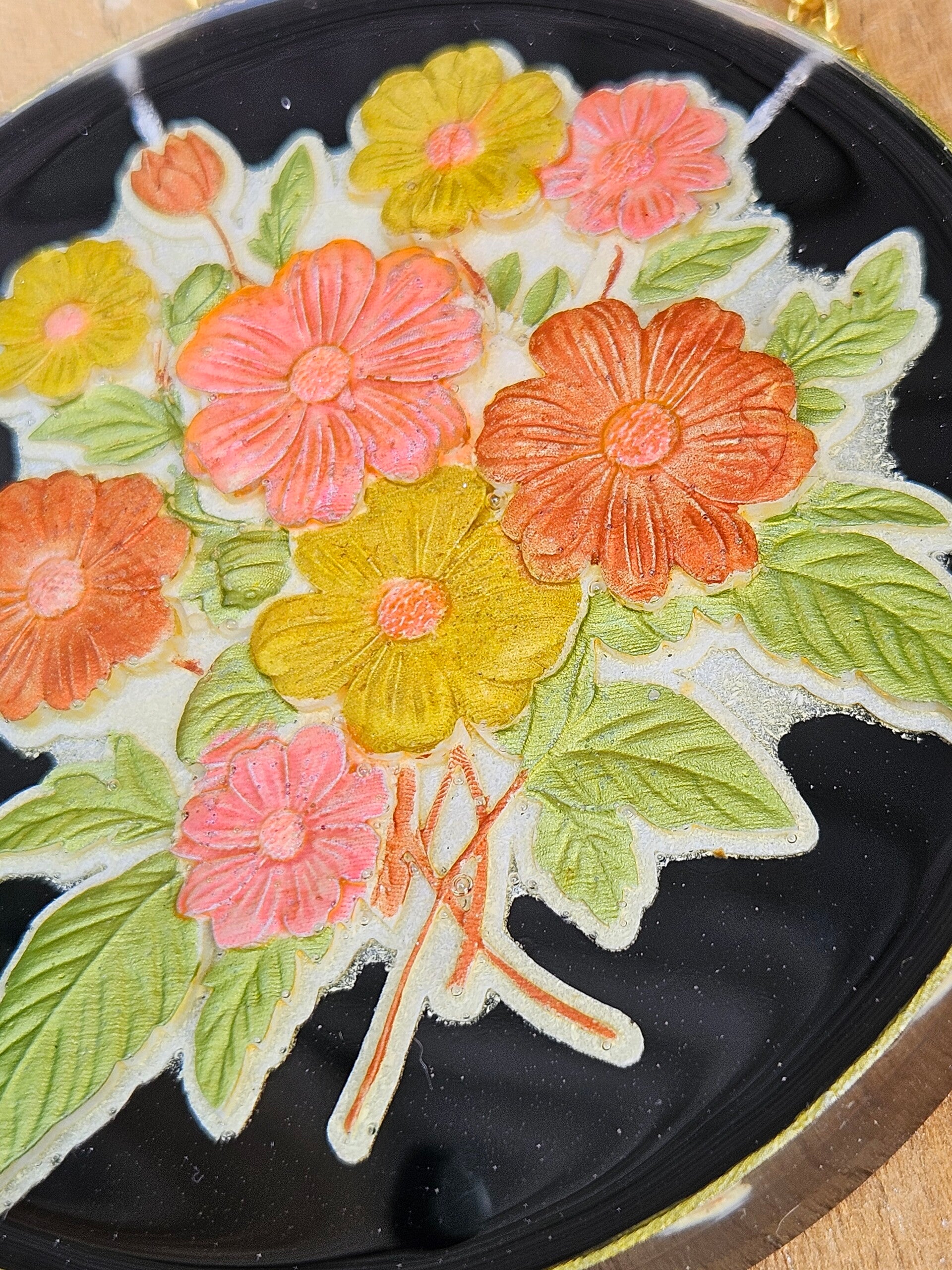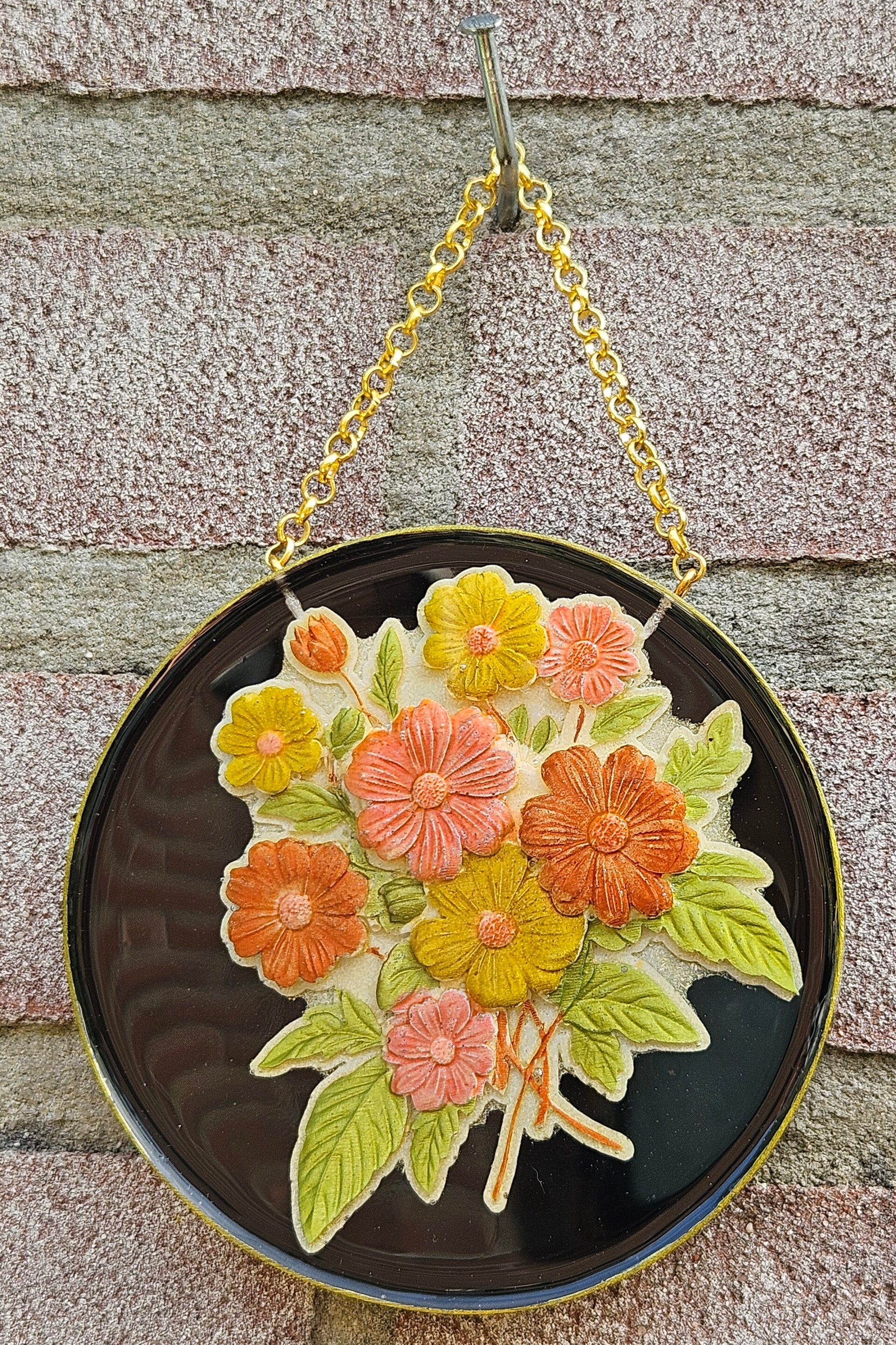 Dit kunstwerkje is gemaakt van sprankelend epoxy en bevat een ornamament gemaakt van epoxy welke gekleurd en ingegoten is. Elke cirkel is uniek, vol kleur en natuurlijke schoonheid, perfect om je muur een frisse, speelse en botanische touch te geven. Makkelijk op te hangen — zo haal je een stukje natuur en kleur in huis.