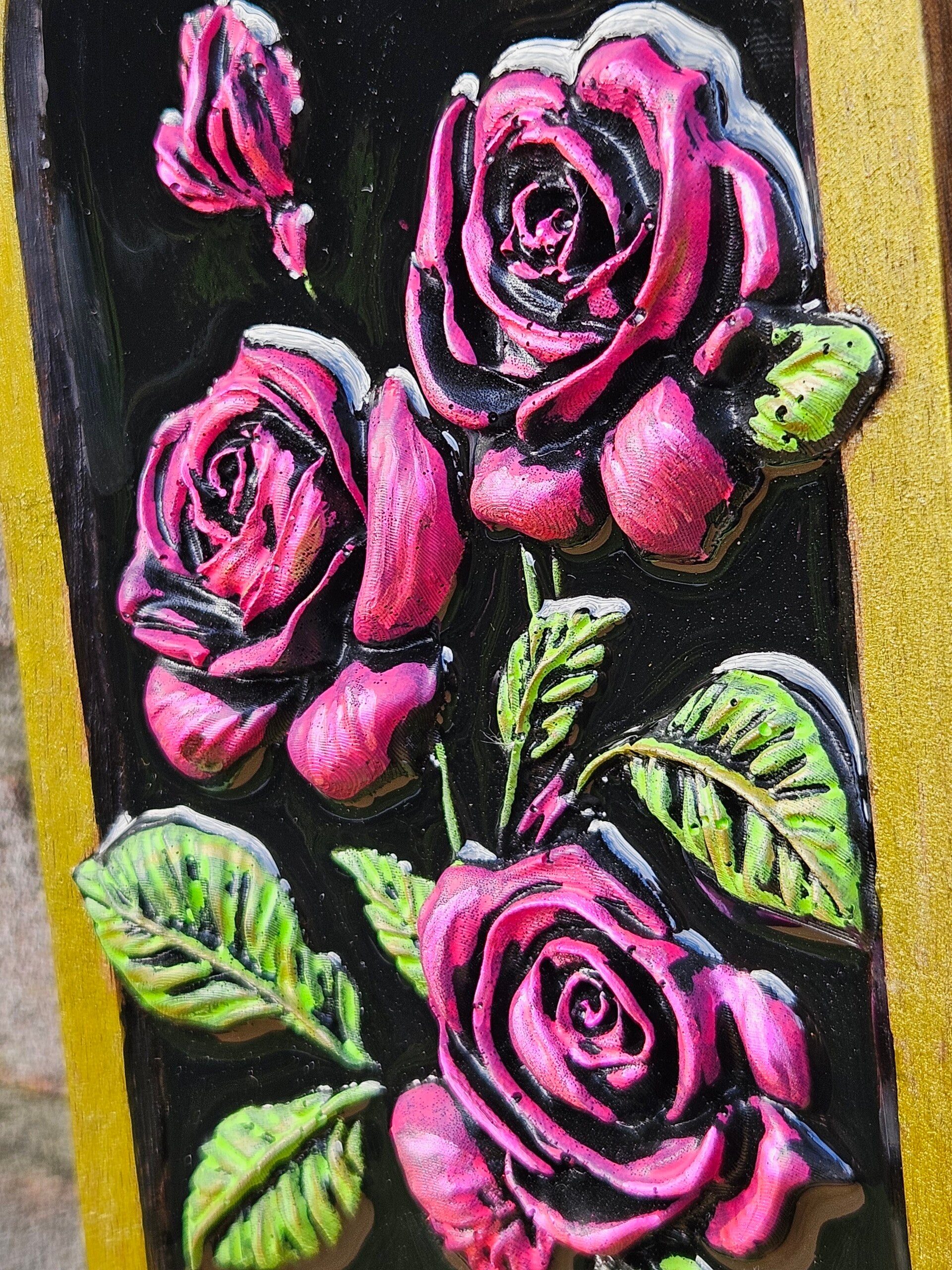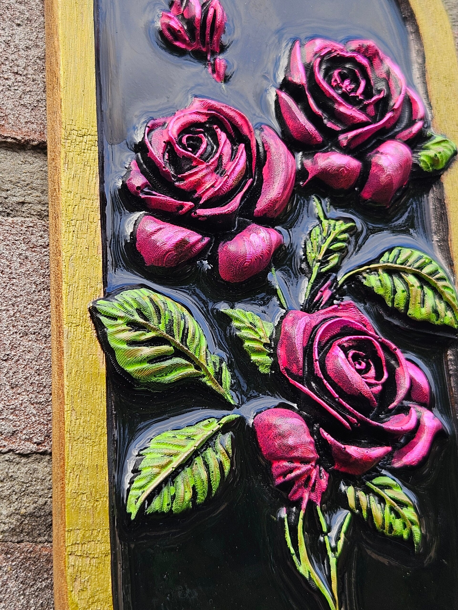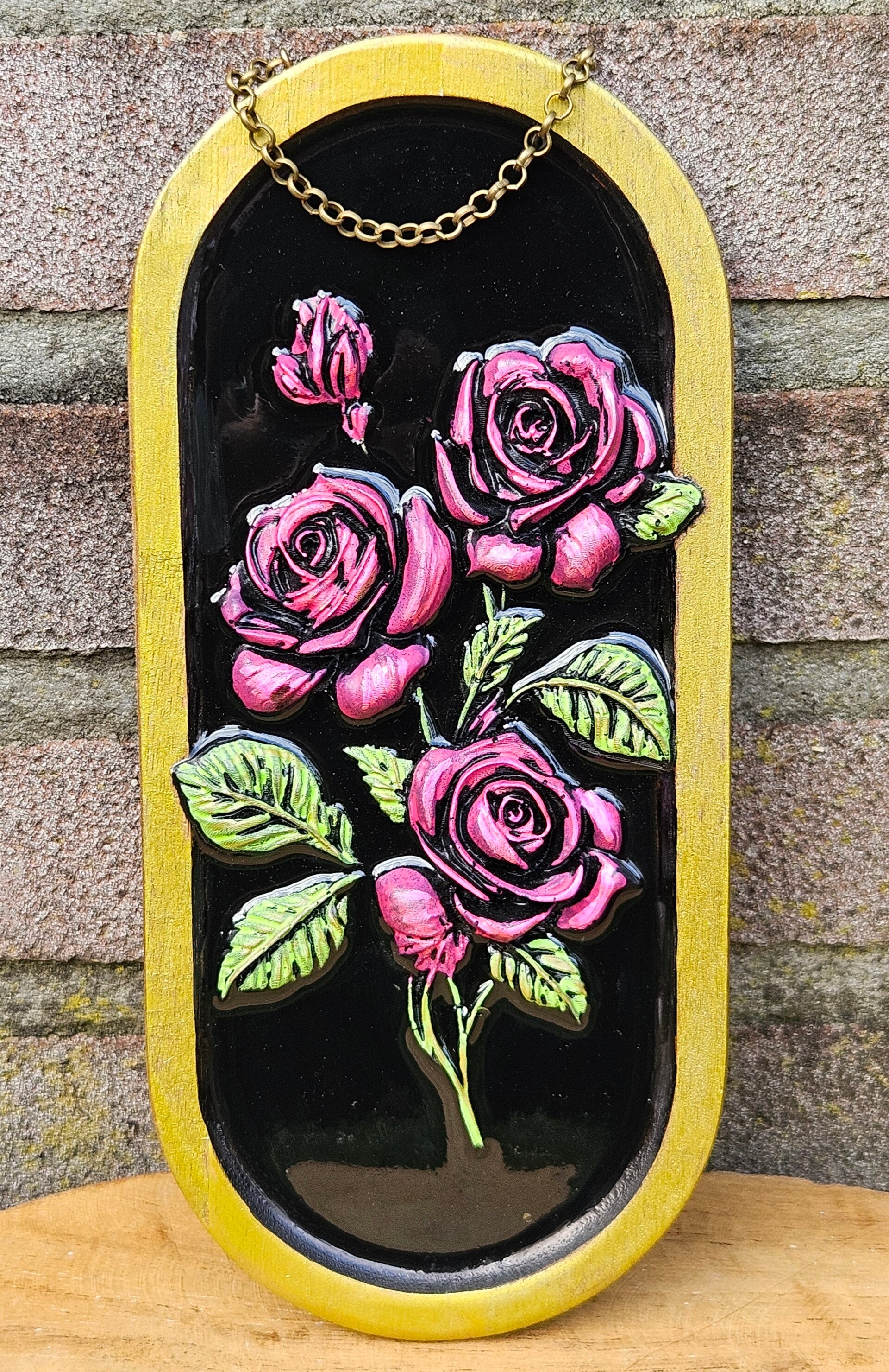 *Uniek rozenboeket in houten vorm met zwarte epoxy – 22,5 x 10 x 1,5 cm*
