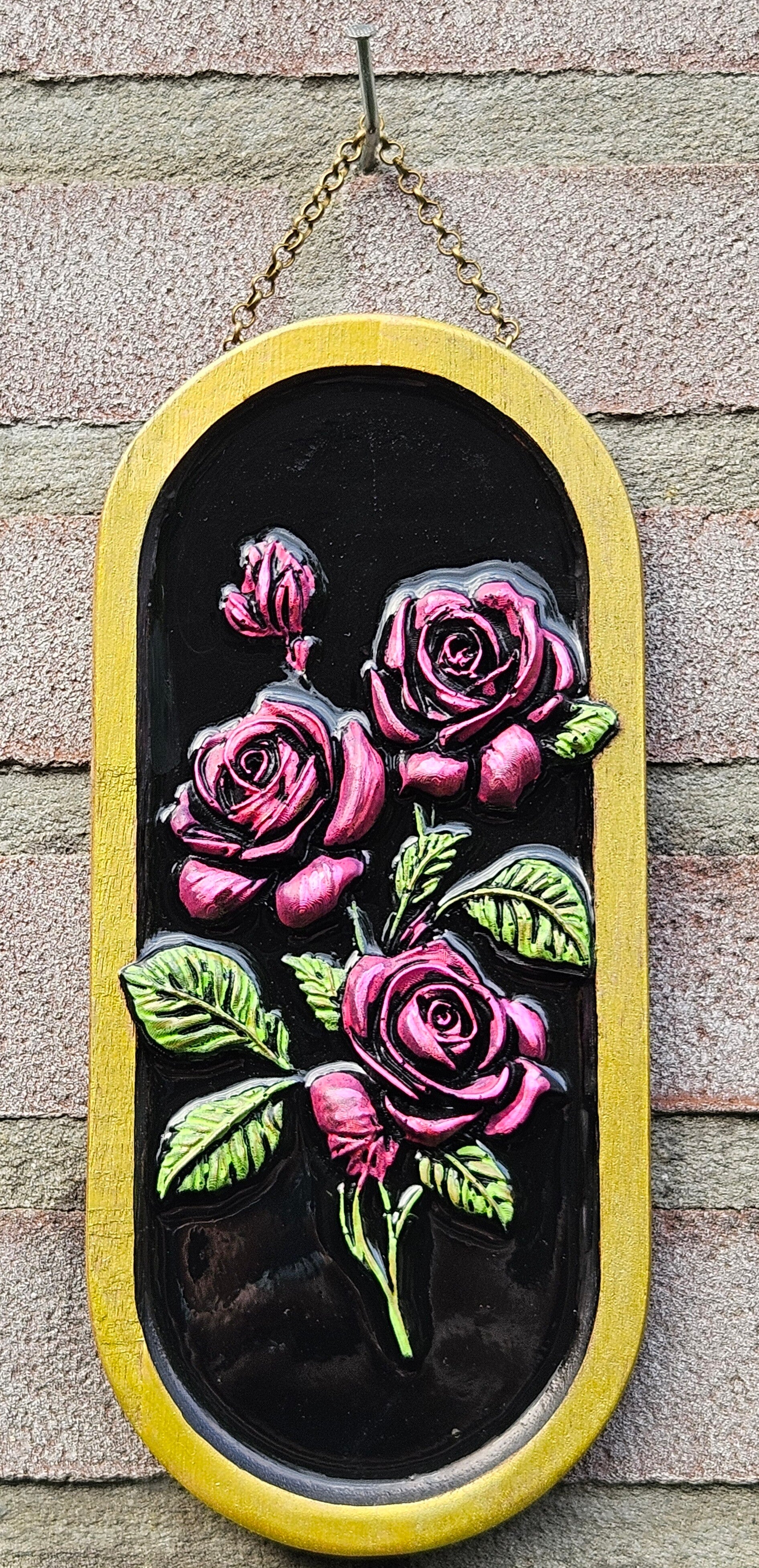 Dit bijzondere kunstwerk combineert een natuurlijk houten frame met een diepzwarte epoxy achtergrond, waarin een zelfgegoten rozenboeket prachtig tot leven komt. Het contrast tussen het warme hout, het strakke zwart en de delicate rozen zorgt voor een stijlvol en opvallend geheel. Klaar om op te hangen en jouw muur direct karakter en elegantie te geven!