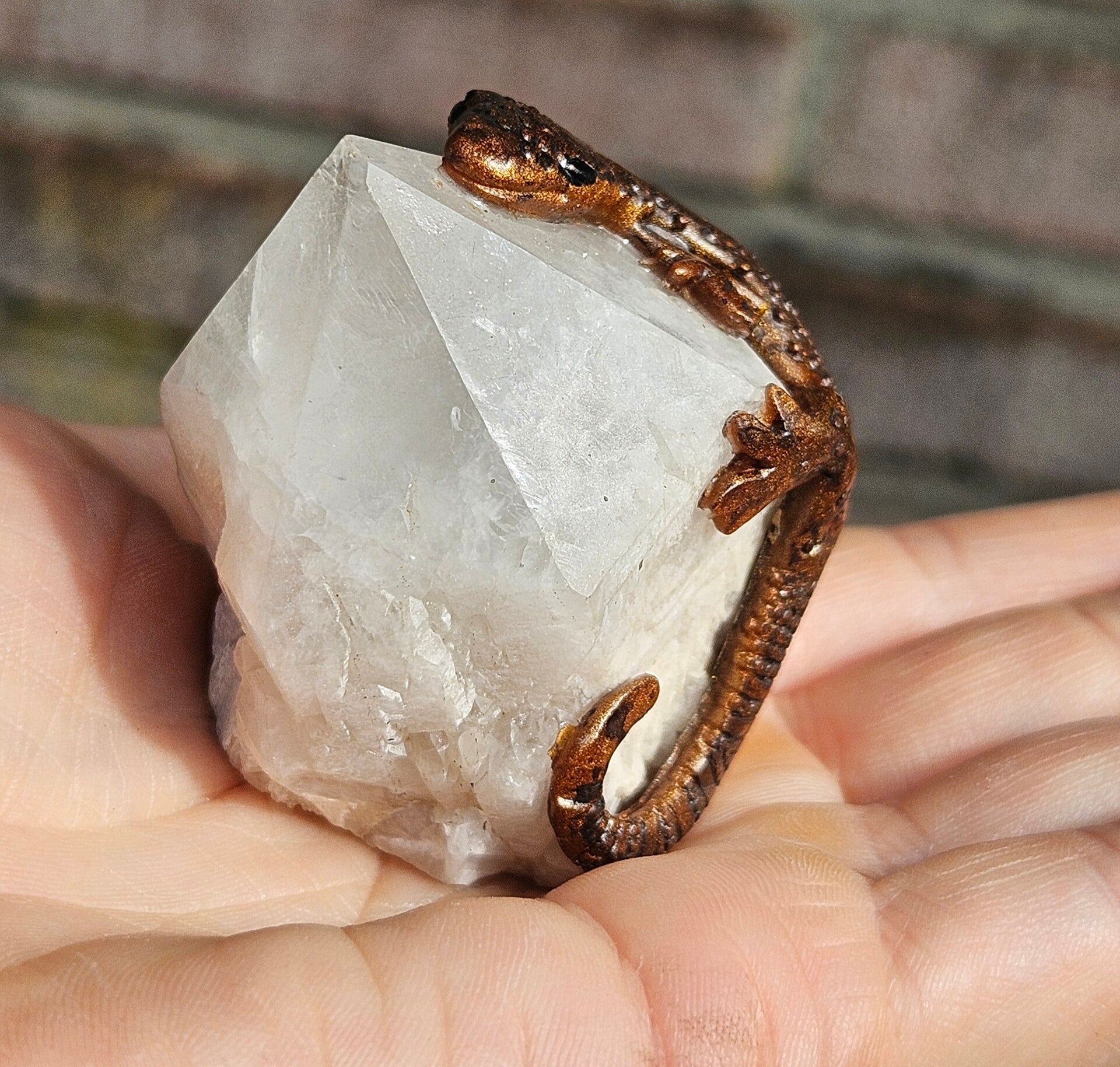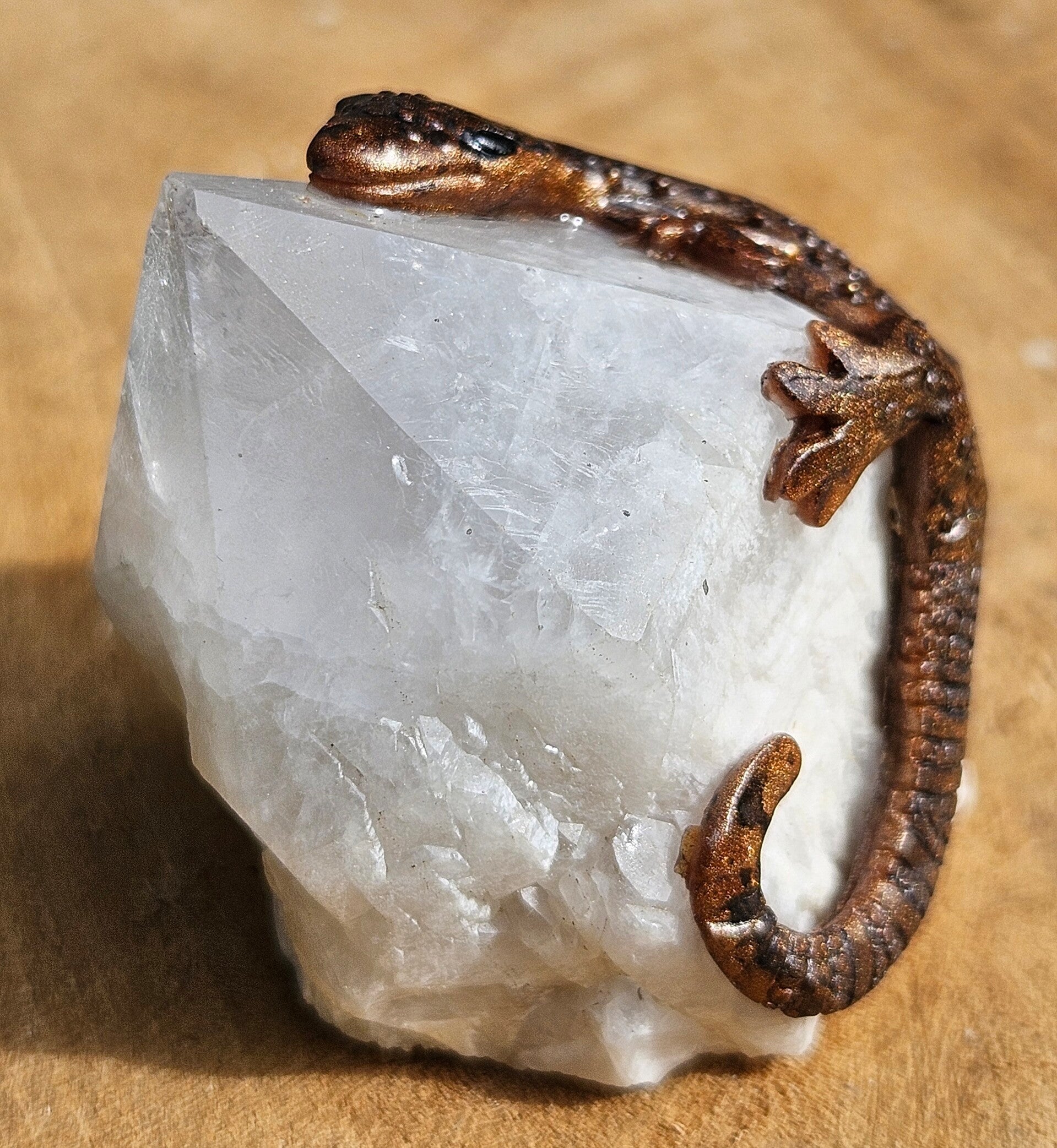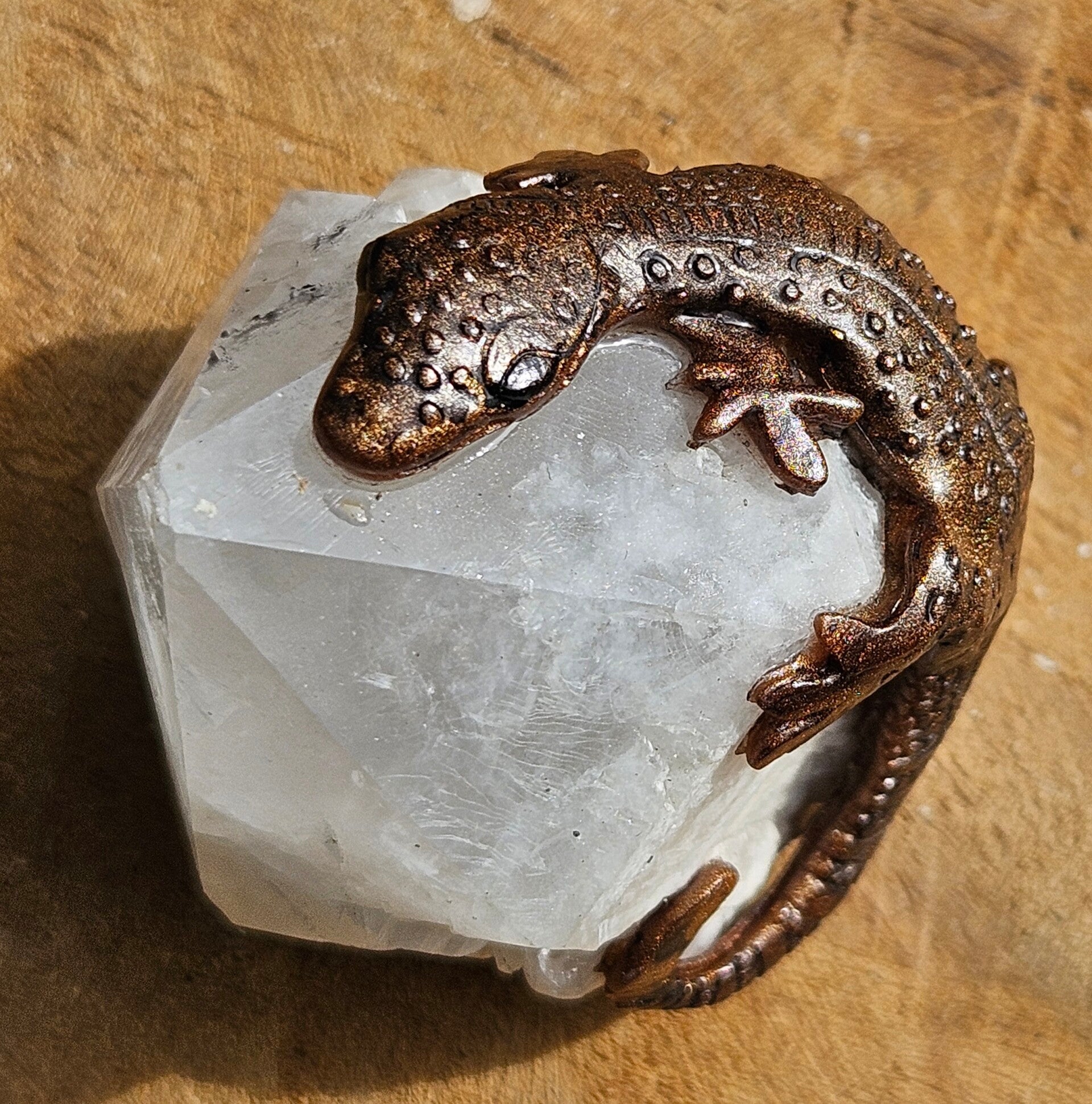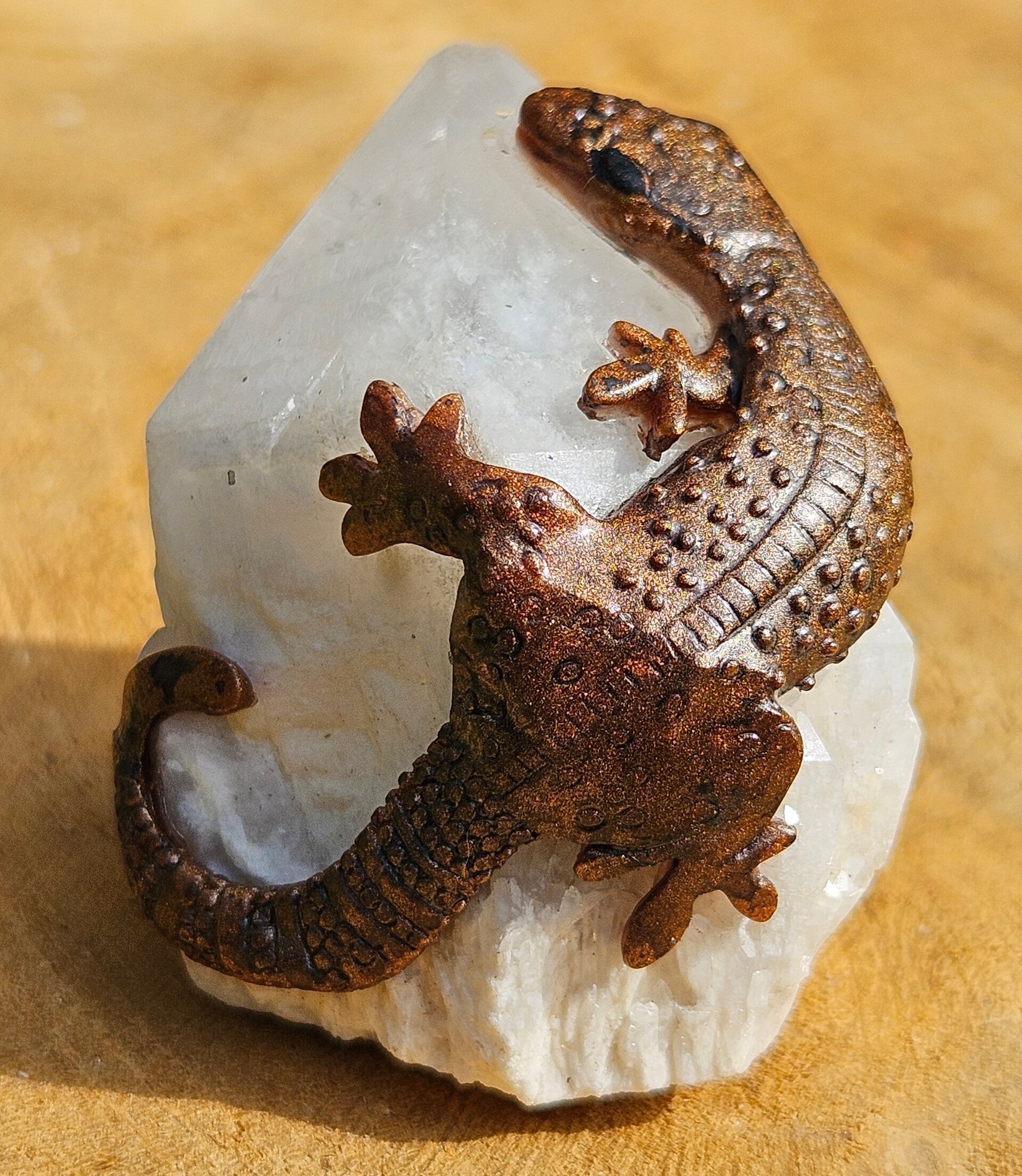 Dit fijne, handgemaakte hagedisje rust elegant op een stuk natuurlijke candle quartz. De warme, kristallijne structuur van de candle quartz vormt een prachtig contrast met het speelse, gedetailleerde hagedisje, waardoor een uniek en sfeervol kunstobject ontstaat. Ideaal als decoratie voor liefhebbers van mineralen en ambachtelijke kunst, of als bijzonder cadeau.
