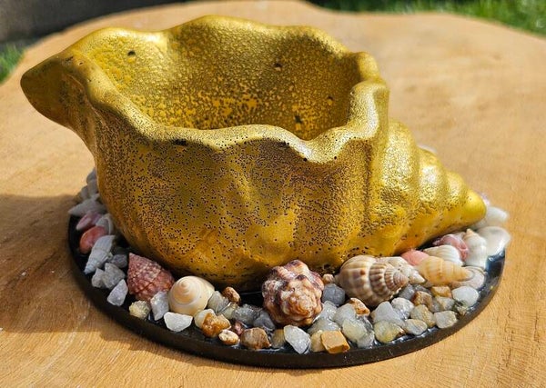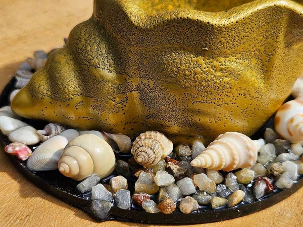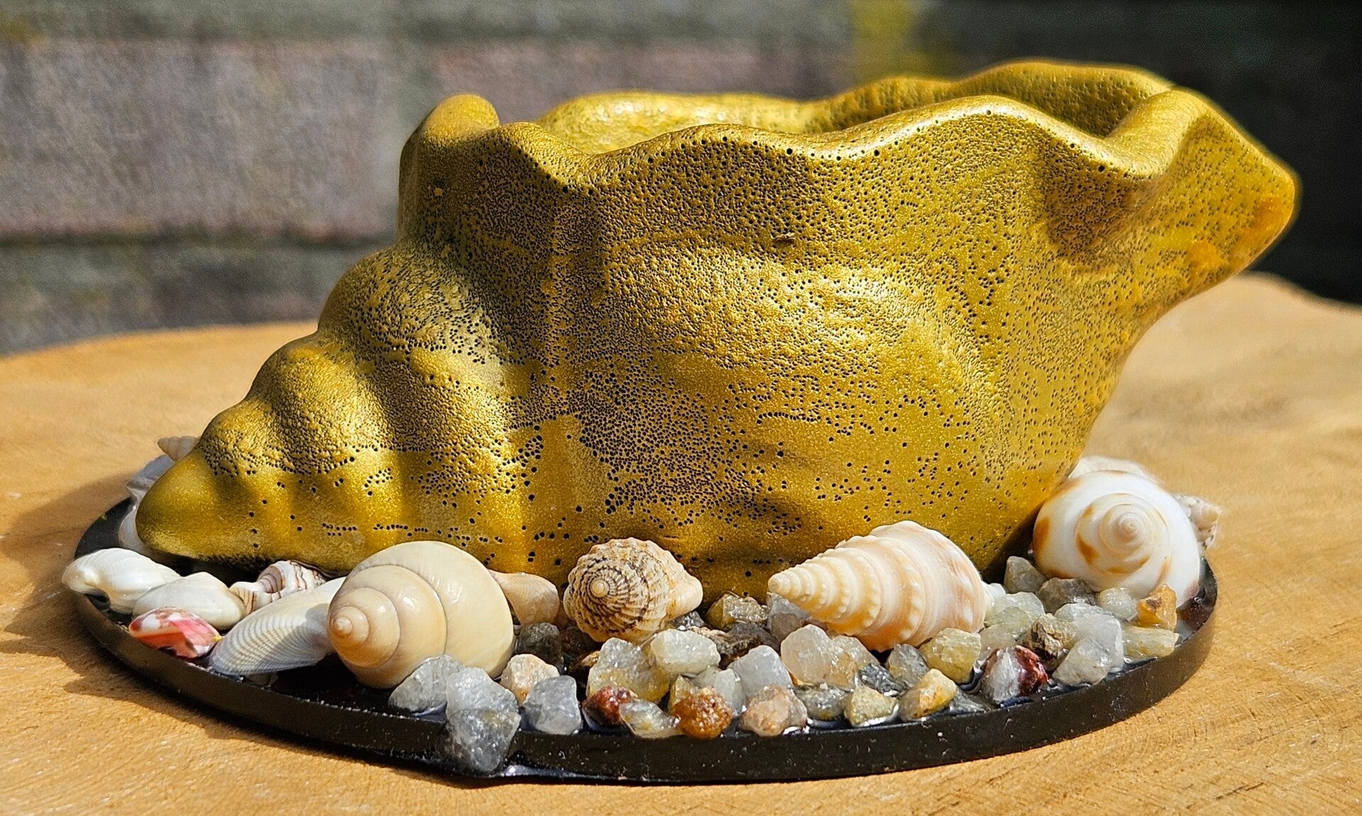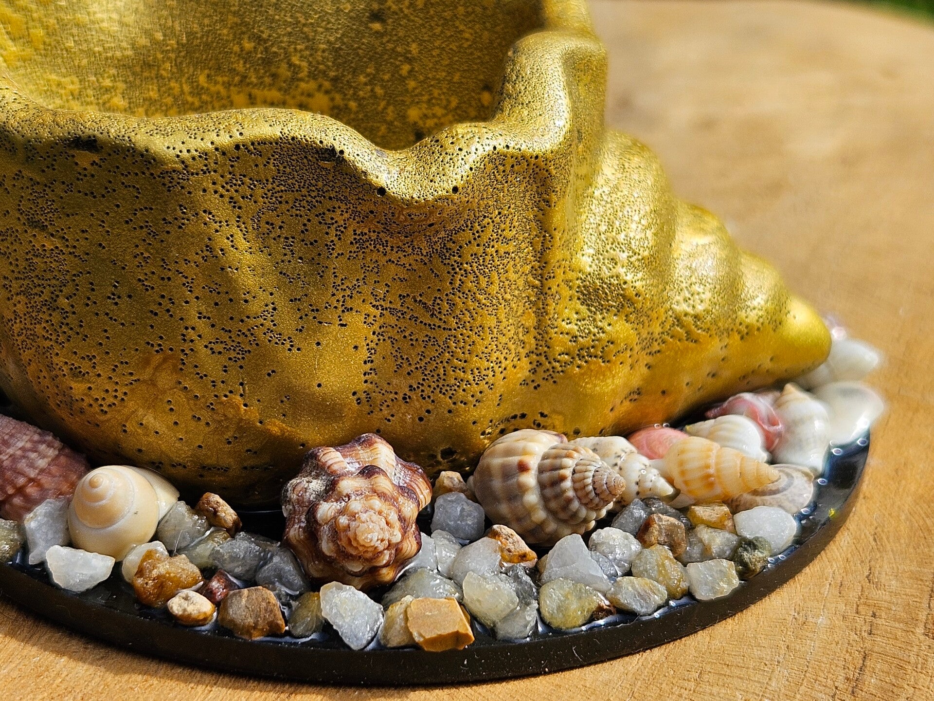 Deze unieke creatie combineert de puurheid van de zee met een vleugje luxe. Een prachtige schelp, afgewerkt met een gouden glans, staat centraal op een ronde epoxy schijf van 10 cm doorsnede. Rondom is het kunstwerk versierd met allerlei echte schelpjes en steentjes, waardoor het lijkt alsof je een stukje strand in huis haalt – maar dan met een sprankelend gouden accent.