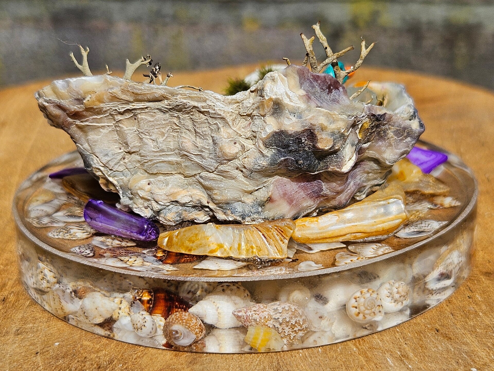 Een klein kunstwerkje voor je tafel: een gegoten epoxy onderzetter gevuld met glinsterende schelpjes. Bovenop prijkt een lief eendje in een oesterschelp samen met stukjes oesterschelp en bloemetjes. Een speels en sfeervol stukje natuur om van te genieten.