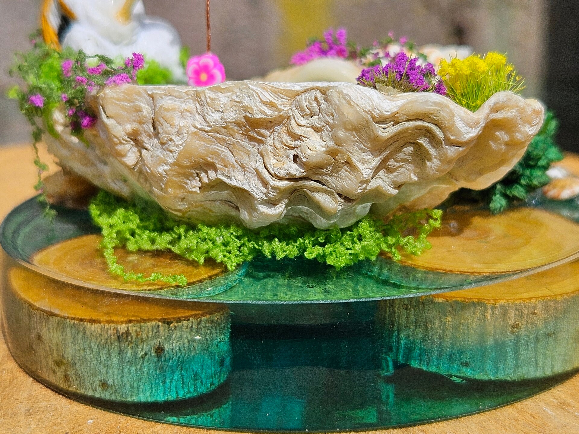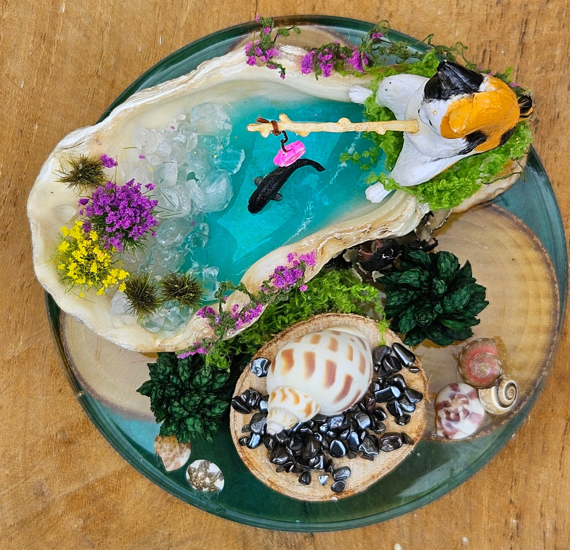 Kijk ‘m eens zitten, dat schattige katje in z’n schelp! Deze gegoten epoxy onderzetter is gevuld met houten schijfjes en bovenop zit een schattige vissende kat in een oester schelp. Een vrolijk en uniek kunstwerkje voor op tafel of in je interieur.