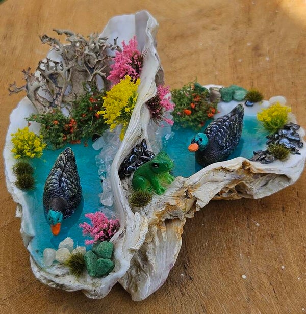 *Miniatuur landschapje dubbele oesterschelp en eenden*