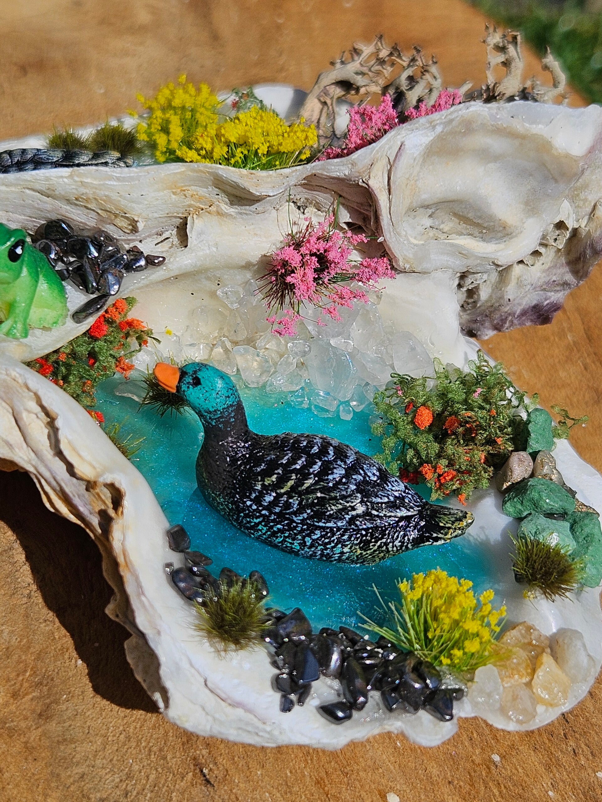 Dubbel zo charmant! Twee lieve eenden zwemmen rustig elk in hun eigen oesterschelp Omringd door glinsterende steentjes en vrolijke kunstbloemetjes, een uniek natuurkunstwerk voor jouw interieur.