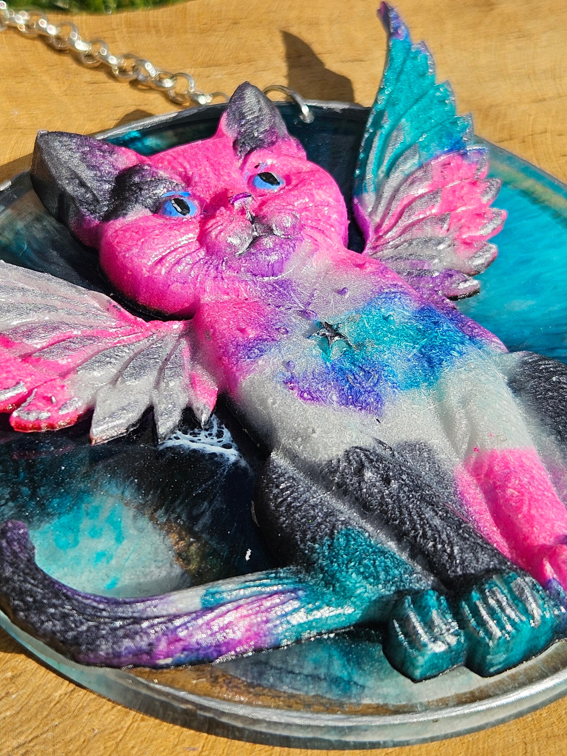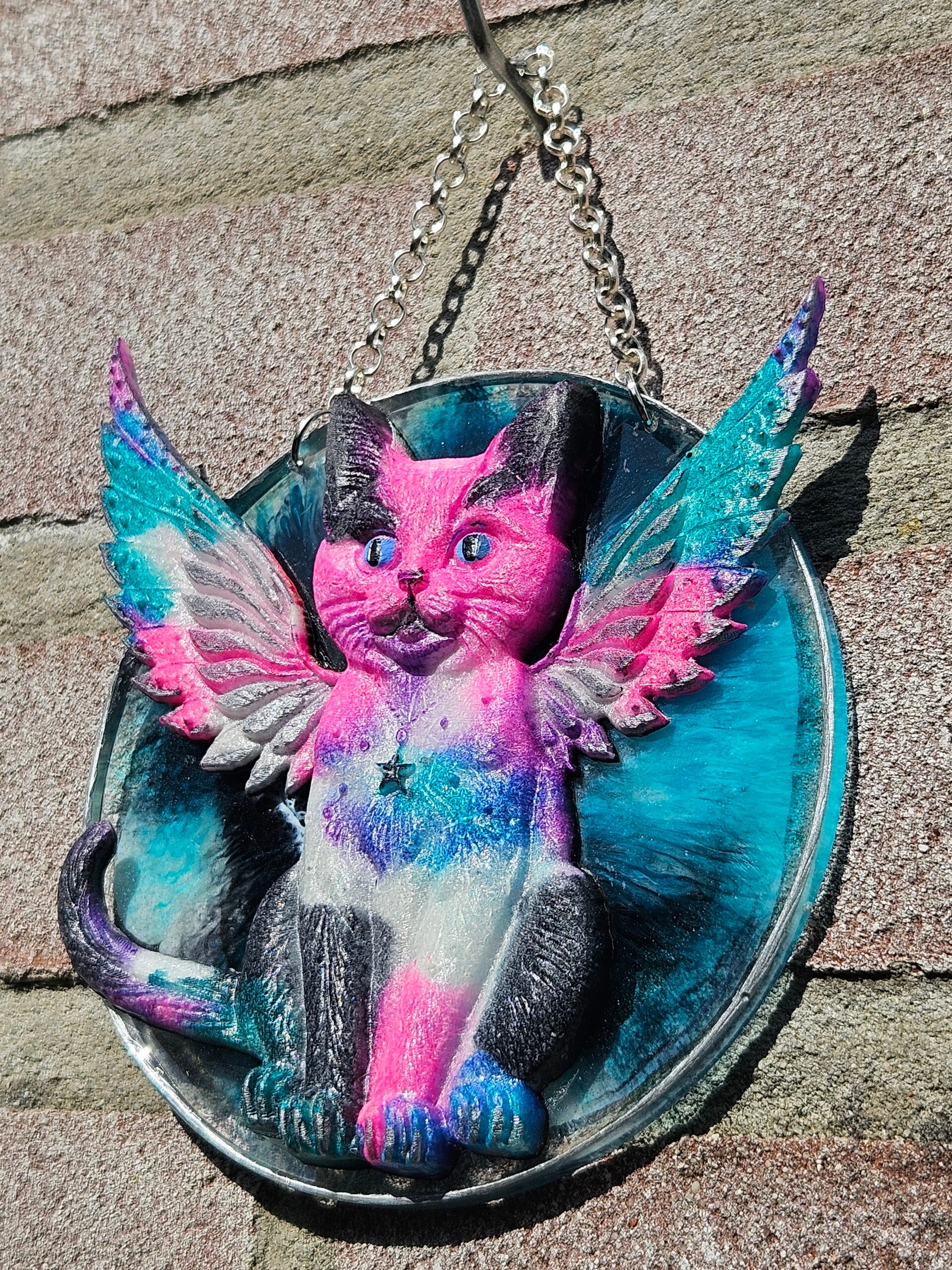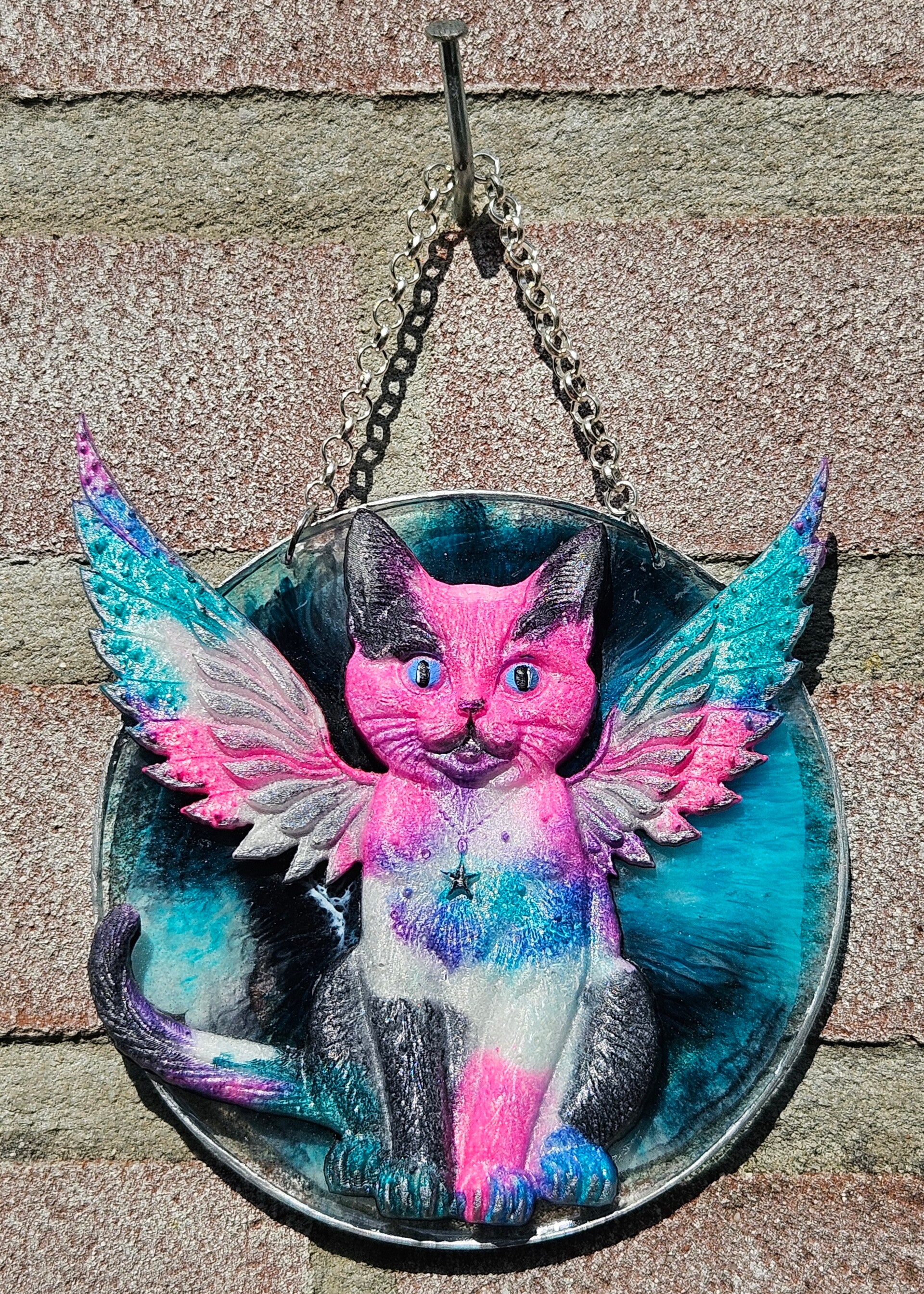 Deze unieke hanger bestaat uit een epoxy rondje (11 x 11 x 1 cm) met een handgegoten 3D katje erop, compleet met engelenvleugels. Een subtiel, hemels eerbetoon aan onze geliefde viervoeters – of ze nu nog naast je spinnen of als ster in je hart leven. 💫