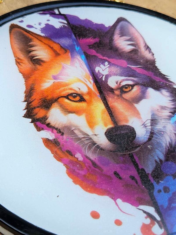 Geef je muur een krachtige uitstraling met deze handgemaakte epoxy muurcirkel! Met een doorsnede van 16 cm en een dikte van ca. 0,9 cm is dit kunstwerkje een echte blikvanger. De indrukwekkende wolf in de cirkel straalt kracht en mysterie uit – perfect voor een stoer accent in je interieur of als bijzonder cadeau. Dankzij het handige kettinkje hang je de muurcirkel eenvoudig op.