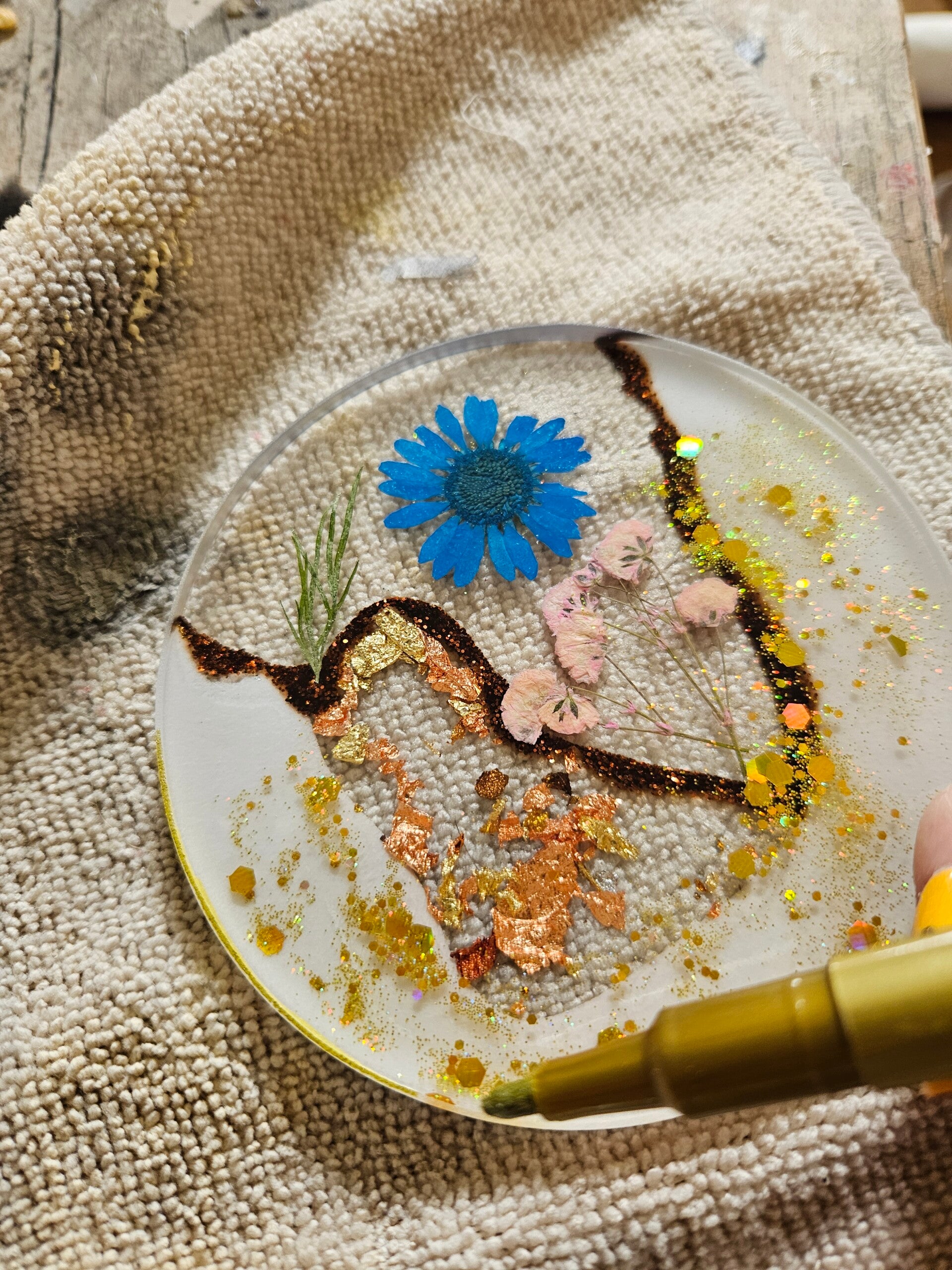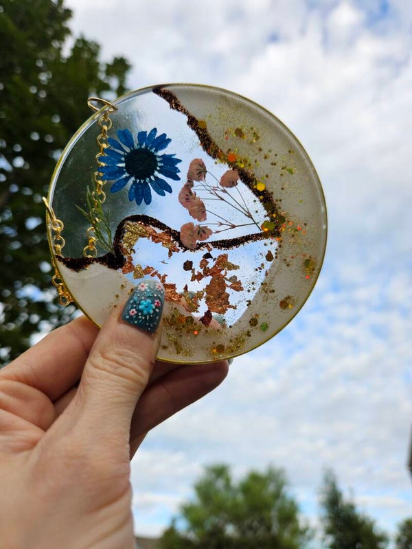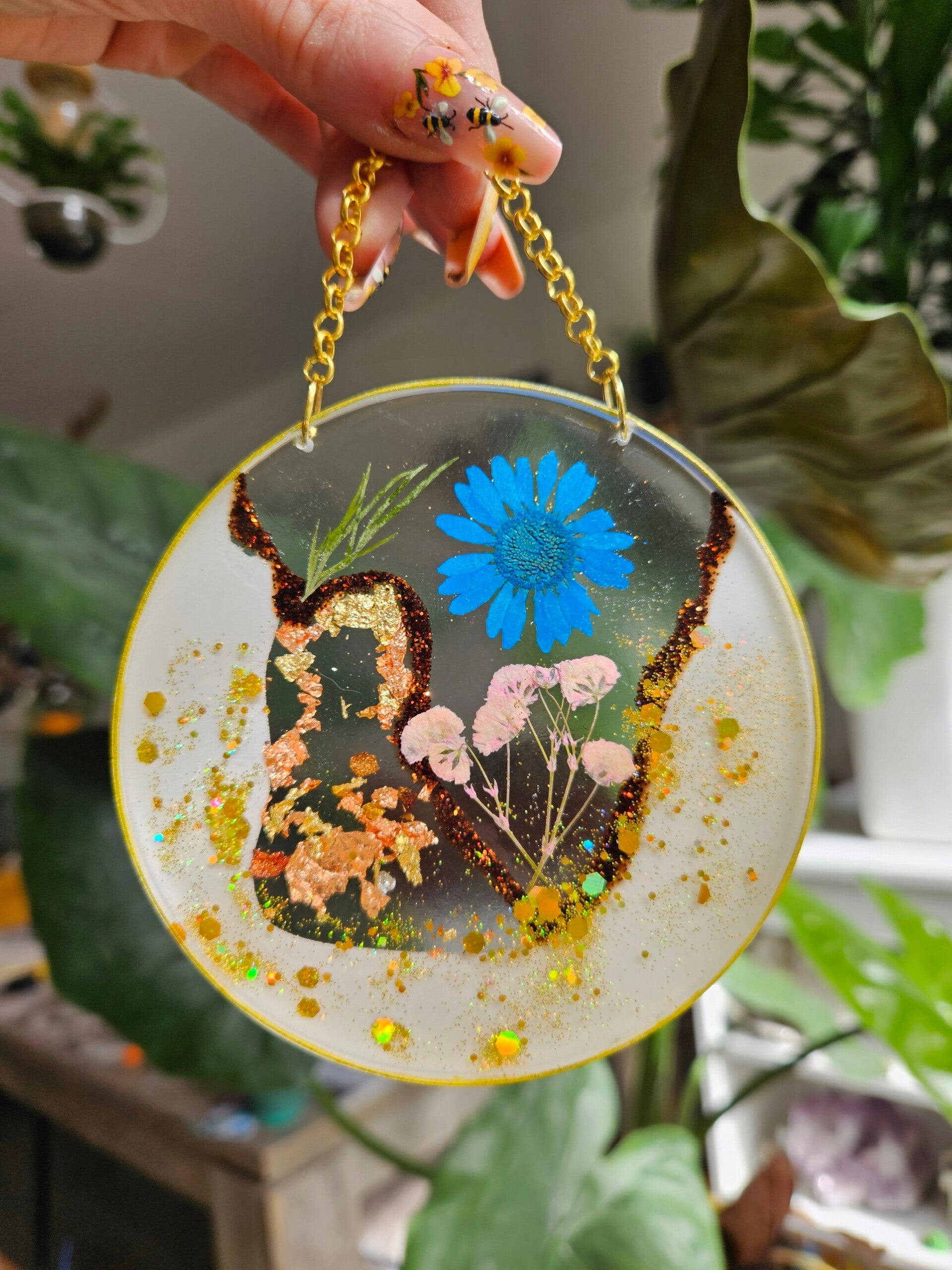 Dit kunstwerkje is gemaakt van sprankelend epoxy en bevat echte, zorgvuldig gedroogde bloemen. Elke cirkel is uniek, vol kleur en natuurlijke schoonheid, perfect om je muur een frisse, speelse en botanische touch te geven. Makkelijk op te hangen — zo haal je een stukje natuur en kleur in huis.