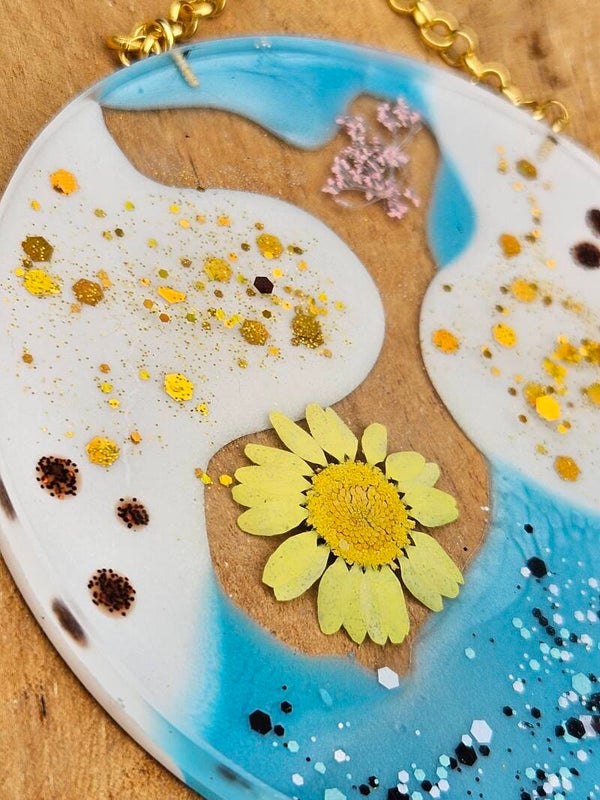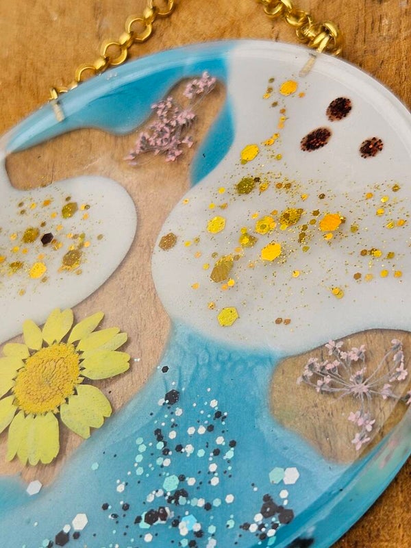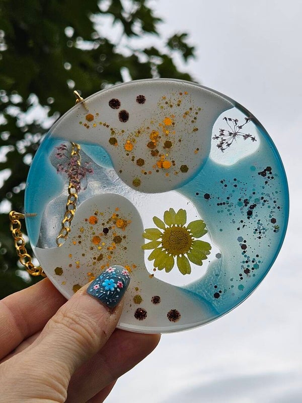 Dit kunstwerkje is gemaakt van sprankelend epoxy en bevat echte, zorgvuldig gedroogd bloem. Elke cirkel is uniek, vol kleur en natuurlijke schoonheid, perfect om je muur een frisse, speelse en botanische touch te geven. Makkelijk op te hangen — zo haal je een stukje natuur en kleur in huis.