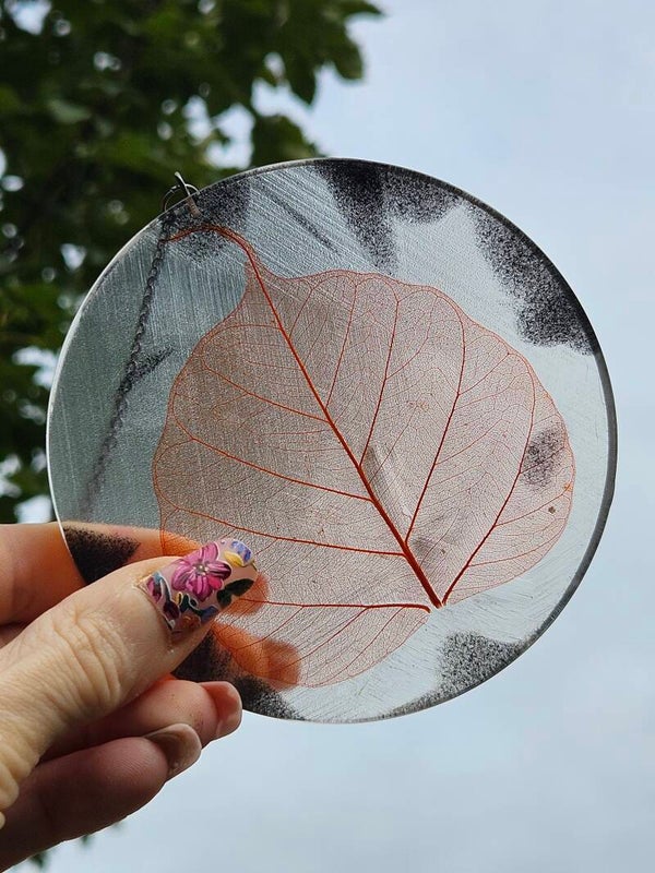 Laat de natuur stralen in je interieur met deze unieke epoxy muurcirkel! In het semi- transparante epoxy ligt een écht gedroogd blad – alsof het even stilgezet is in de tijd. Met een diameter van 10 cm en een extra lang kettinkje van 12 cm komt deze circkel het mooist tot zijn recht voor een raam of hangend. Zo vangt het blad het licht en lijkt het haast te dansen in de zonnestralen.