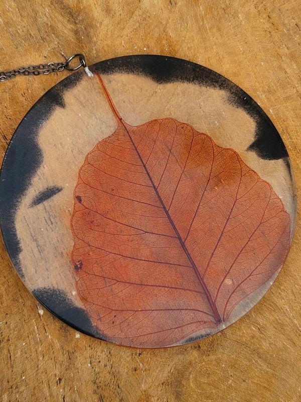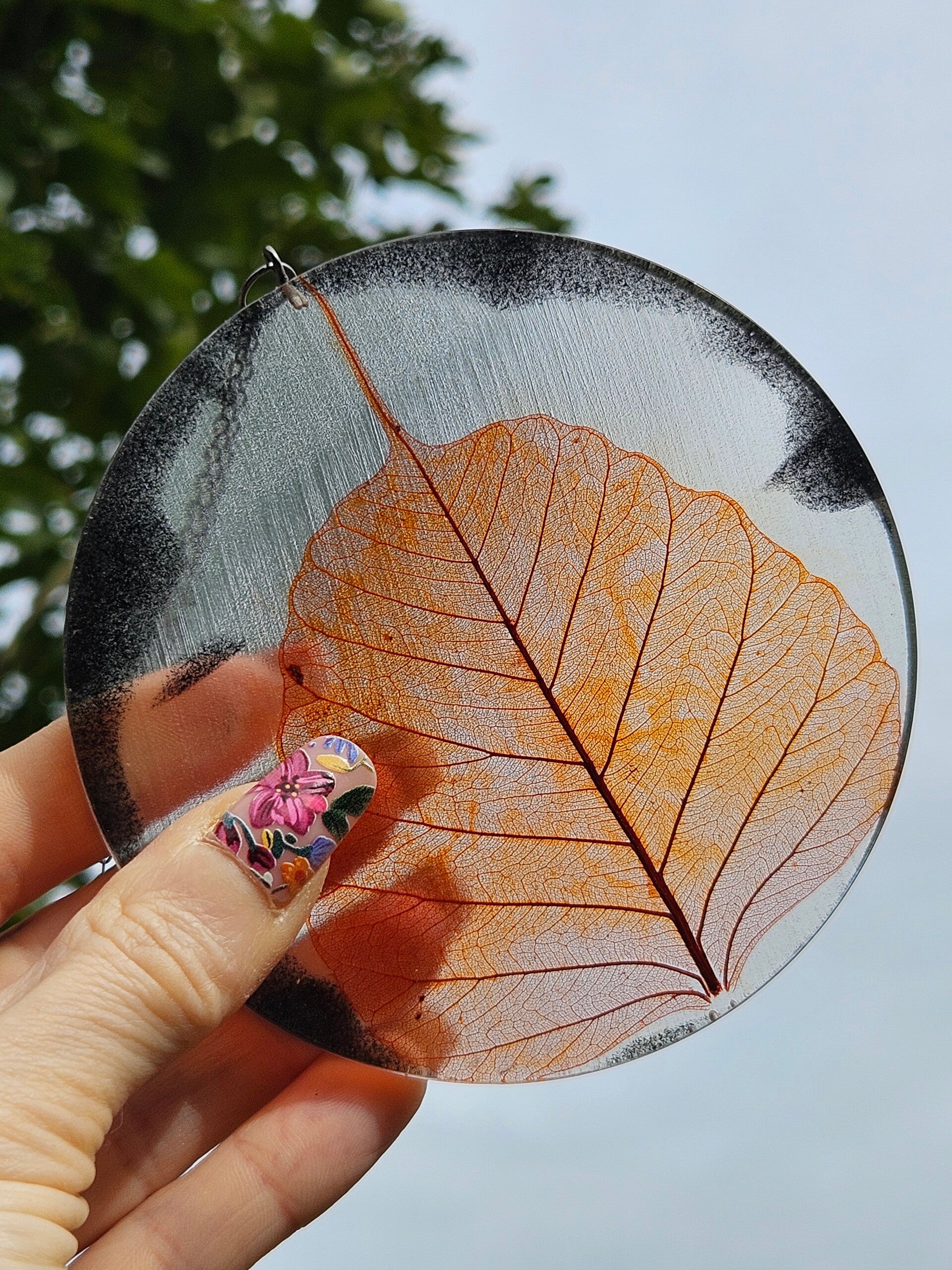 Laat de natuur stralen in je interieur met deze unieke epoxy muurcirkel! In het semi- transparante epoxy ligt een écht gedroogd blad – alsof het even stilgezet is in de tijd. Met een diameter van 10 cm en een extra lang kettinkje van 12 cm komt deze circkel het mooist tot zijn recht voor een raam of hangend. Zo vangt het blad het licht en lijkt het haast te dansen in de zonnestralen.