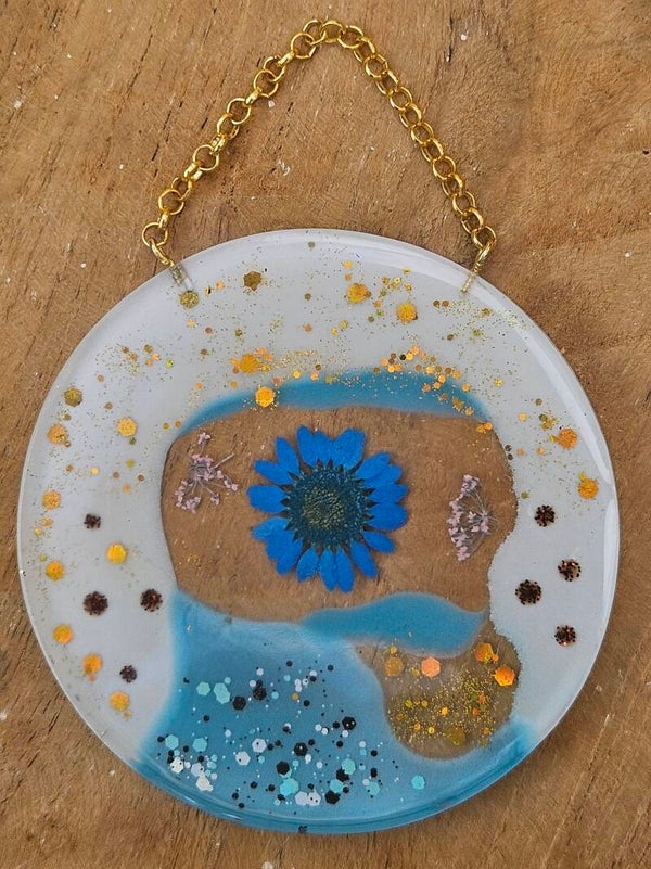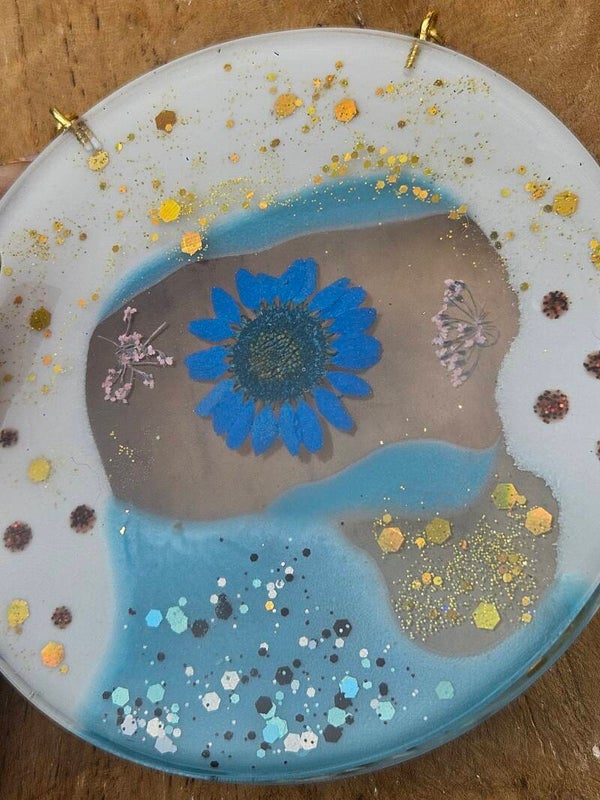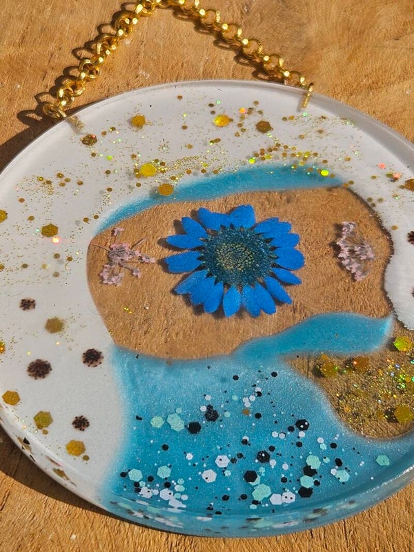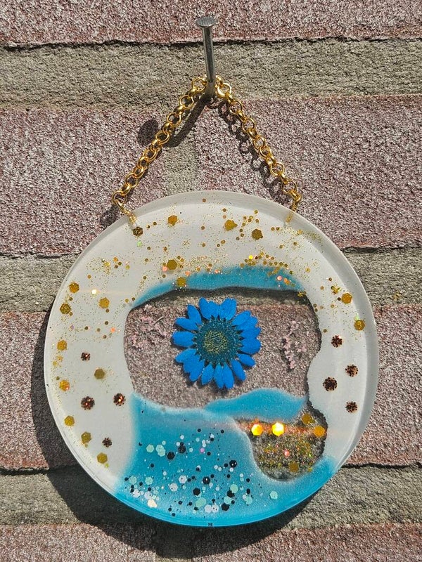 Dit kunstwerkje is gemaakt van sprankelend epoxy en bevat echte, zorgvuldig gedroogd bloem. Elke cirkel is uniek, vol kleur en natuurlijke schoonheid, perfect om je muur een frisse, speelse en botanische touch te geven. Makkelijk op te hangen — zo haal je een stukje natuur en kleur in huis.