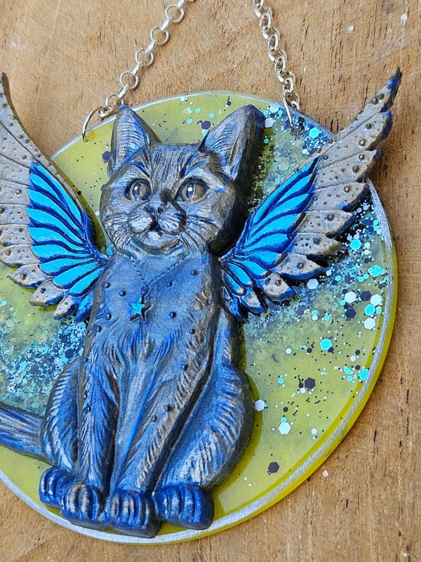 Deze unieke hanger bestaat uit een epoxy rondje (11 x 11 x 1 cm) met een handgegoten 3D katje erop, compleet met engelenvleugels. Een subtiel, hemels eerbetoon aan onze geliefde viervoeters – of ze nu nog naast je spinnen of als ster in je hart leven. 💫