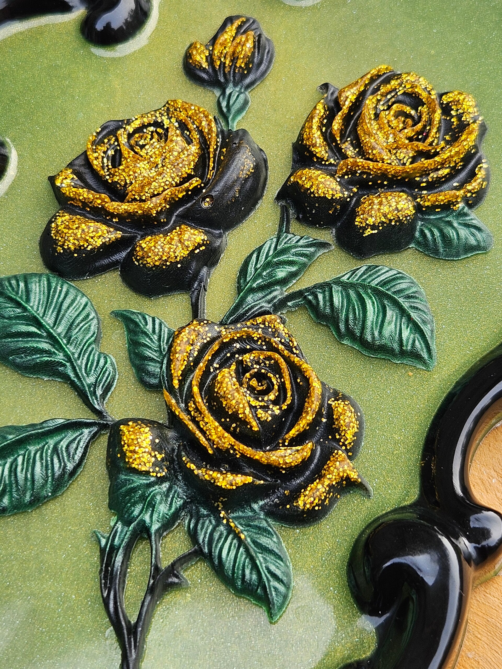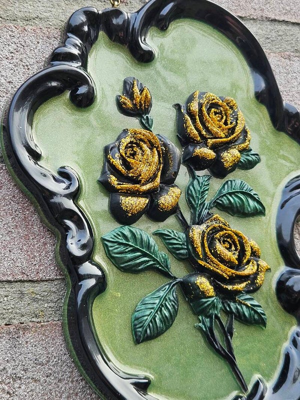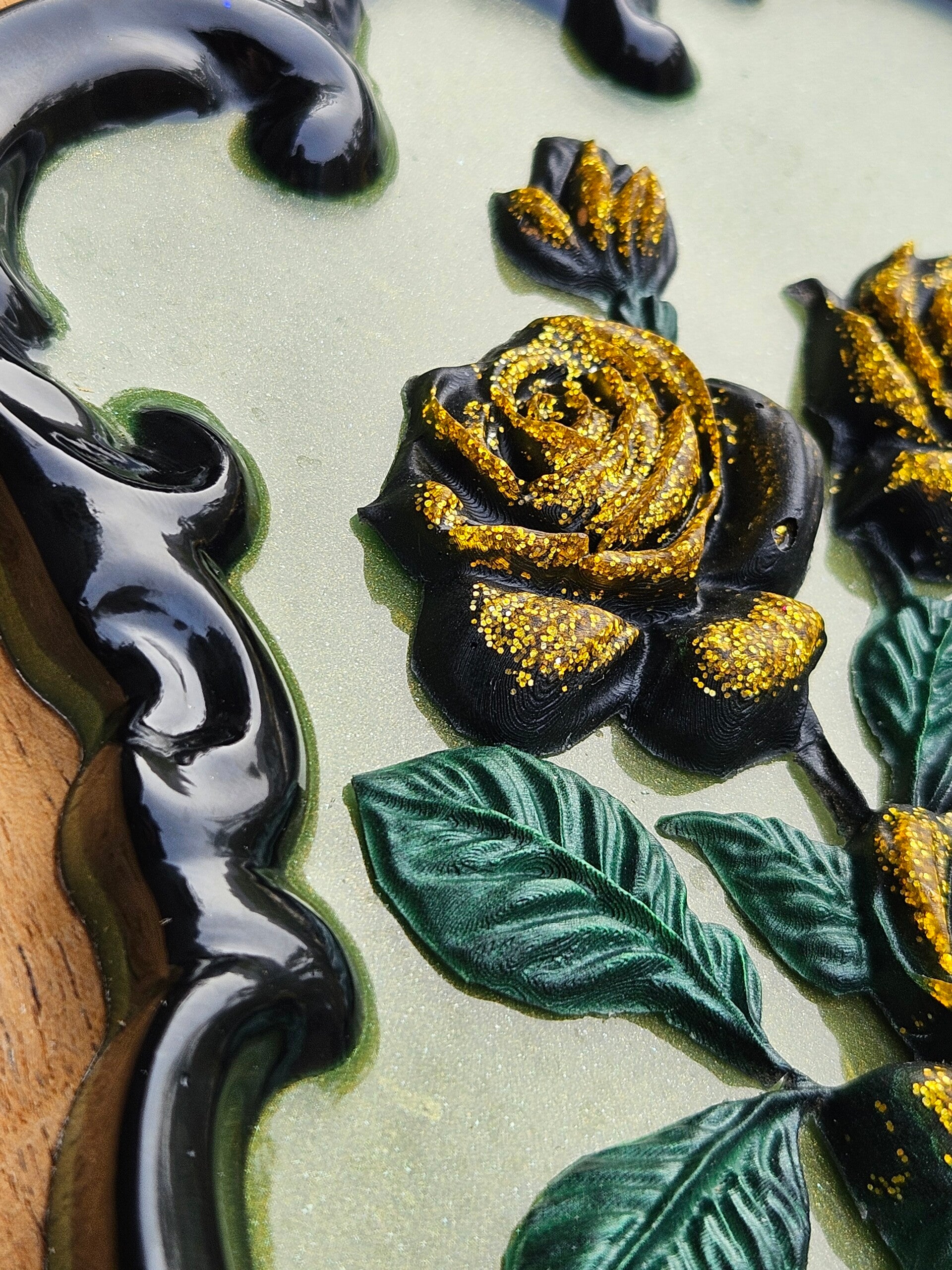 Voeg een vleugje elegantie toe aan je interieur met dit handgemaakte epoxy bordje. De subtiele gouddetails en vintage uitstraling maken dit stuk uniek. De handgemaakte en gekleurde resinbloemen zorgen voor een romantische, vintage vibe met een speelse twist.