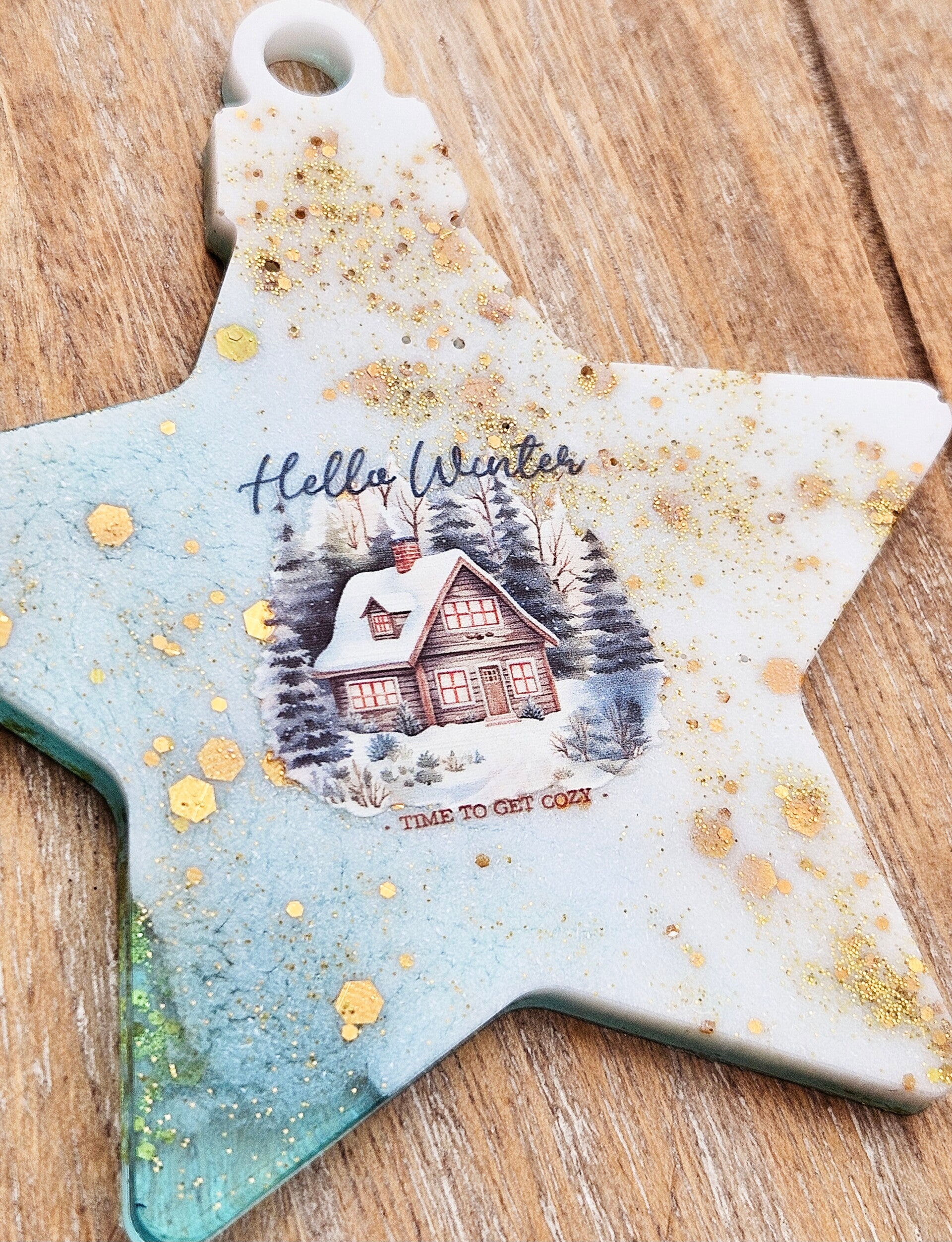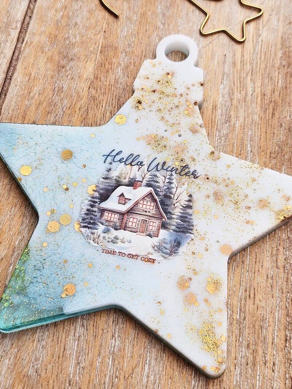 ✨ Kersthangers met Huisje – 8,4 x 9,4 cm ✨Handgemaakte epoxy hangers met de afbeelding van een huisje en tekst. Inclusief haakje met sterretje en feestelijk ingepakt. Perfect voor in de boom, aan een krans of als origineel cadeau.