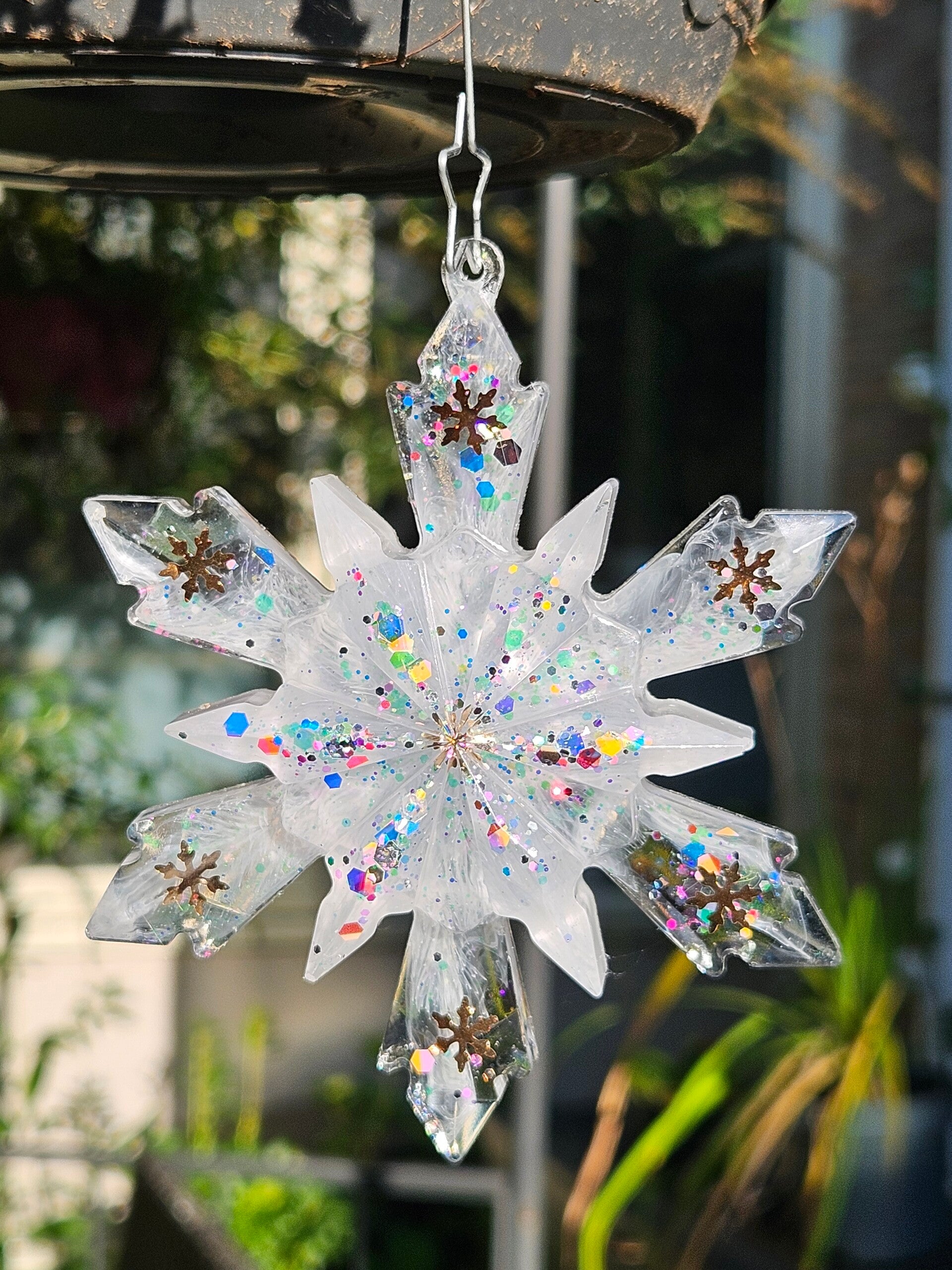 Deze prachtige kersthanger in de vorm van een 3D-sneeuwvlok brengt direct winterse magie in je kerstboom of interieur. Met zorg en liefde gegoten uit epoxy, wat zorgt voor een elegante glans en luxe uitstraling. Inclusief haakjes dus je kunt ze direct ophangen!