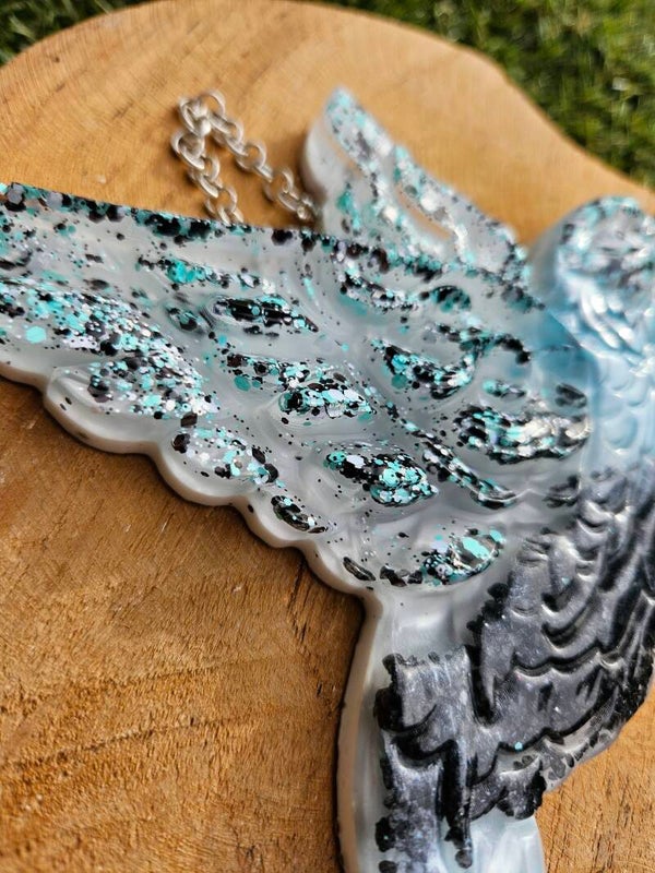 Maak kennis met **Luma the Hummingbird**, een levendig en kleurrijk epoxy ornament dat jouw ruimte direct opfleurt. Met een hoogte van 20 cm, een breedte van 15,5 cm en een dunne, elegante dikte van 0,5 cm, lijkt Luma te fladderen door de lucht met zijn sprankelende kleuren. In haar buik zitten kleine steentjes en in haar vleugels een soort glitters.