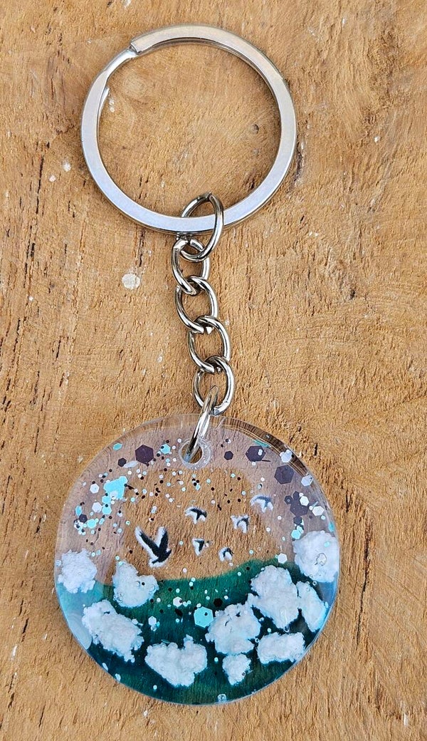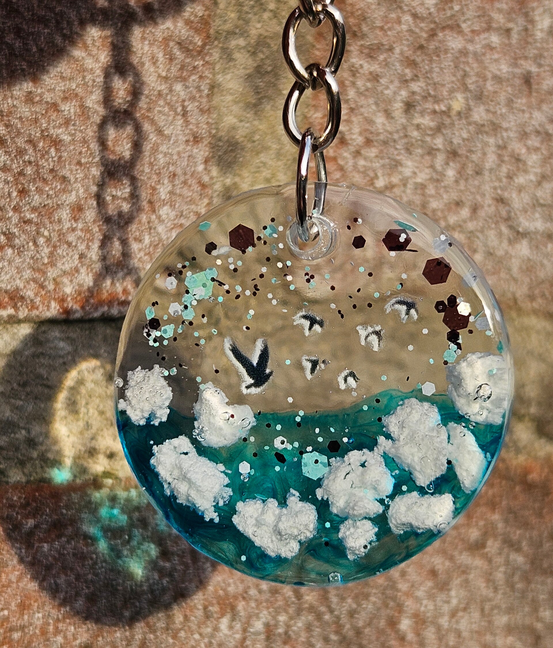 Deze handgemaakte sleutelhanger is als een klein stukje hemel dat je overal mee naartoe neemt. Binnenin bevindt zich een betoverend 3D-tafereeltje met wolkjes en vogeltjes – alsof je even omhoog kijkt naar een vredige lucht. ✨